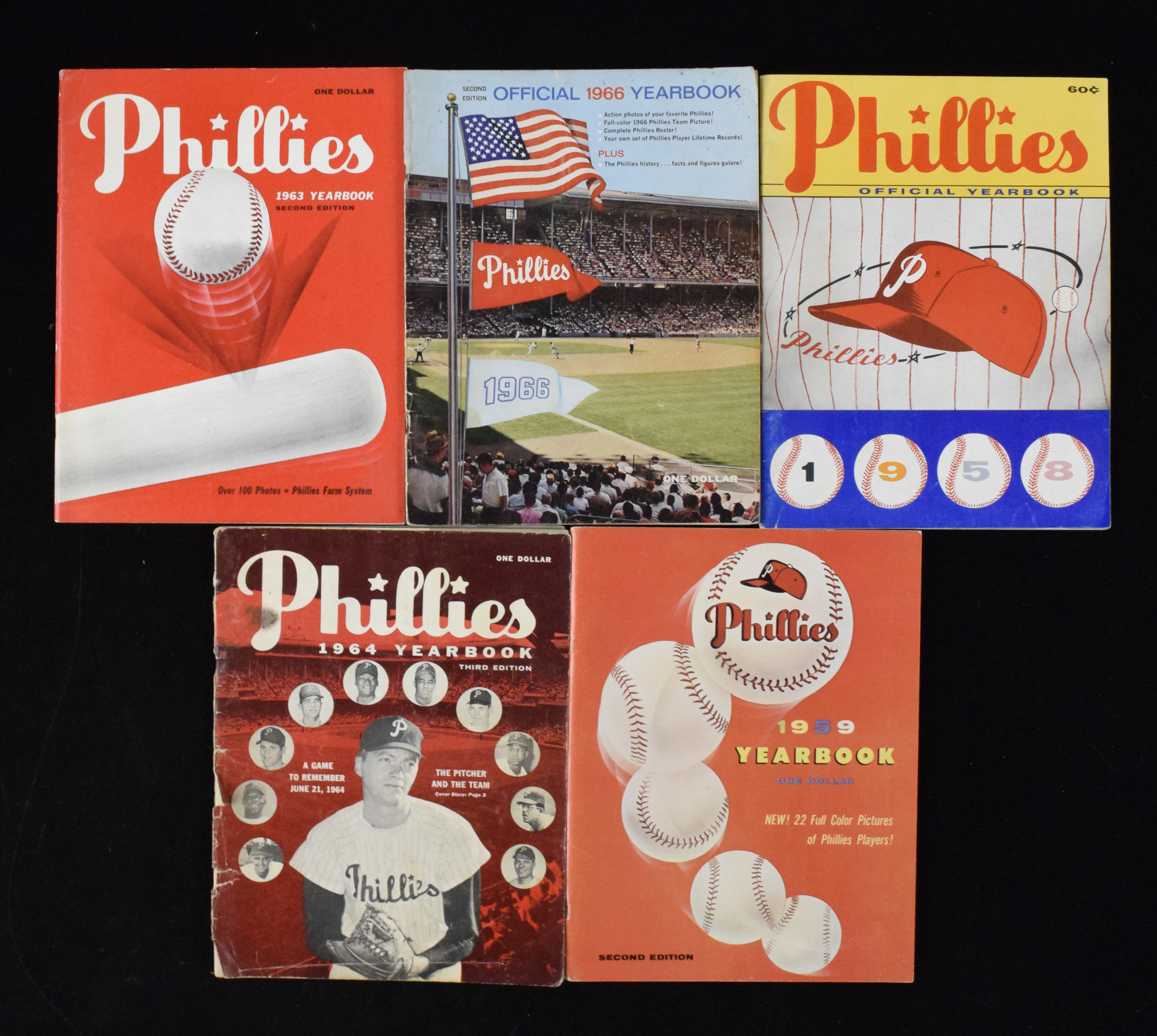 Description:"Lot of (38) 1958-1996 Philadelphia Phillies yearbooks (PR-EX/MT). Good quantity of Phillies yearbooks (with duplication) spanning 1958 through 1996, though issues from 1965, 1966 and 1967 are missing covers. Range: PR-EX/MT. "