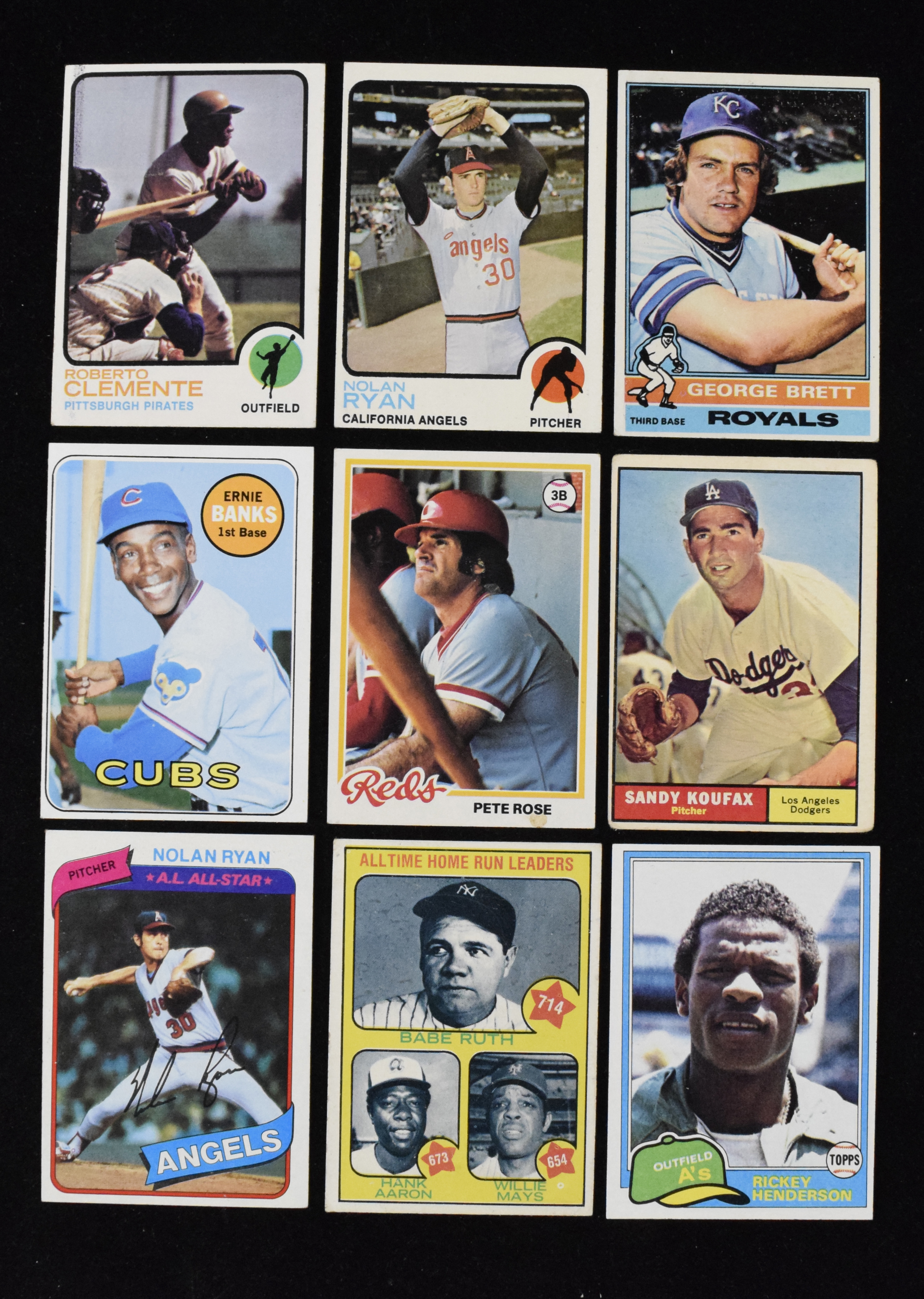 Description:"Two binders of (750+) 1960s-1990s baseball cards with exclusively stars and HOFers (PR-NM/MT. Lot spans two binders filled exclusively with stars, better players and Hall of Famers, though most are from the 1980s and 1990s with some 1960s and 1970s cards sprinkled around. Players include Nolan Ryan, Roberto Clemente, George Brett, Mike Schmidt, Rickey Henderson, Pete Rose, Rod Carew, Ozzie Smith, Kirby Puckett, Wade Boggs, Ryne Sandberg, Johnny Bench and many more. Most 1982 and newer cards appear NM-NM/MT or better, and most older appear VG-VG/EX or worse. Range: PR-NM/MT. "
