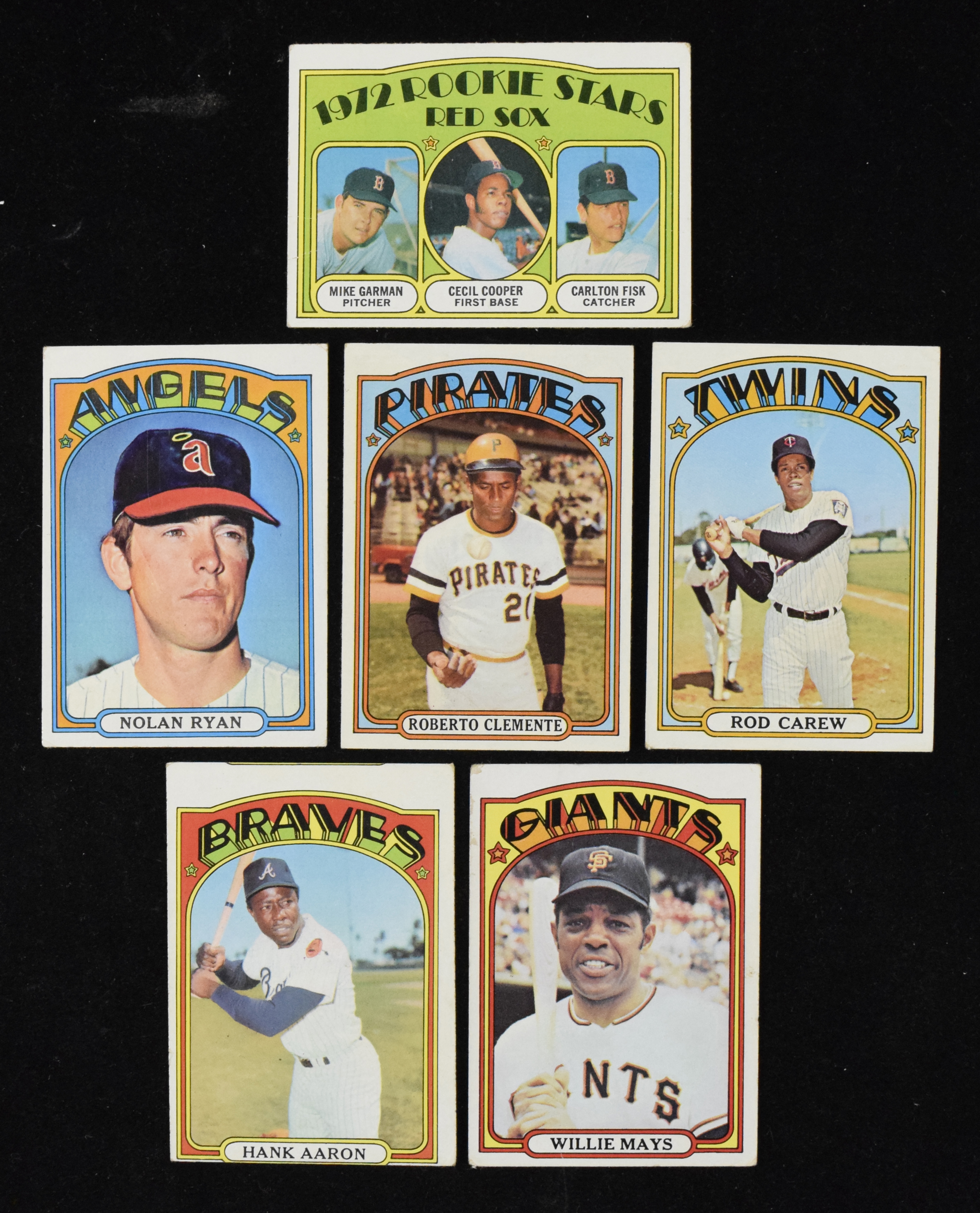 Description:"1972 Topps near-complete set (749/787) with HOFers, including Ryan, Clemente and Aaron (PR-EX). Mostly lower-grade near-complete set includes (749) different cards, missing only (38) mostly high numbers for completion, with every card from #s 1-564 included. Highlights include #s 49 Willie Mays (FR), 79 Carlton Fisk RC (GD), 299 Hank Aaron (GD; miscut), 309 Roberto Clemente (VG/EX), 433 Johnny Bench (VG/EX), 435 Reggie Jackson (EX OC), 559 Pete Rose (PR), 595 Nolan Ryan (VG), 686 Steve Garvey (VG/EX), 695 Rod Carew (VG), 760 Bill Mazeroski (GD), 761 Ron Cey RC (EX OC) and 777 Hoyt Wilhelm (VG/EX). Balance of the near-set appears mostly VG-VG/EX. Range: PR-EX. "