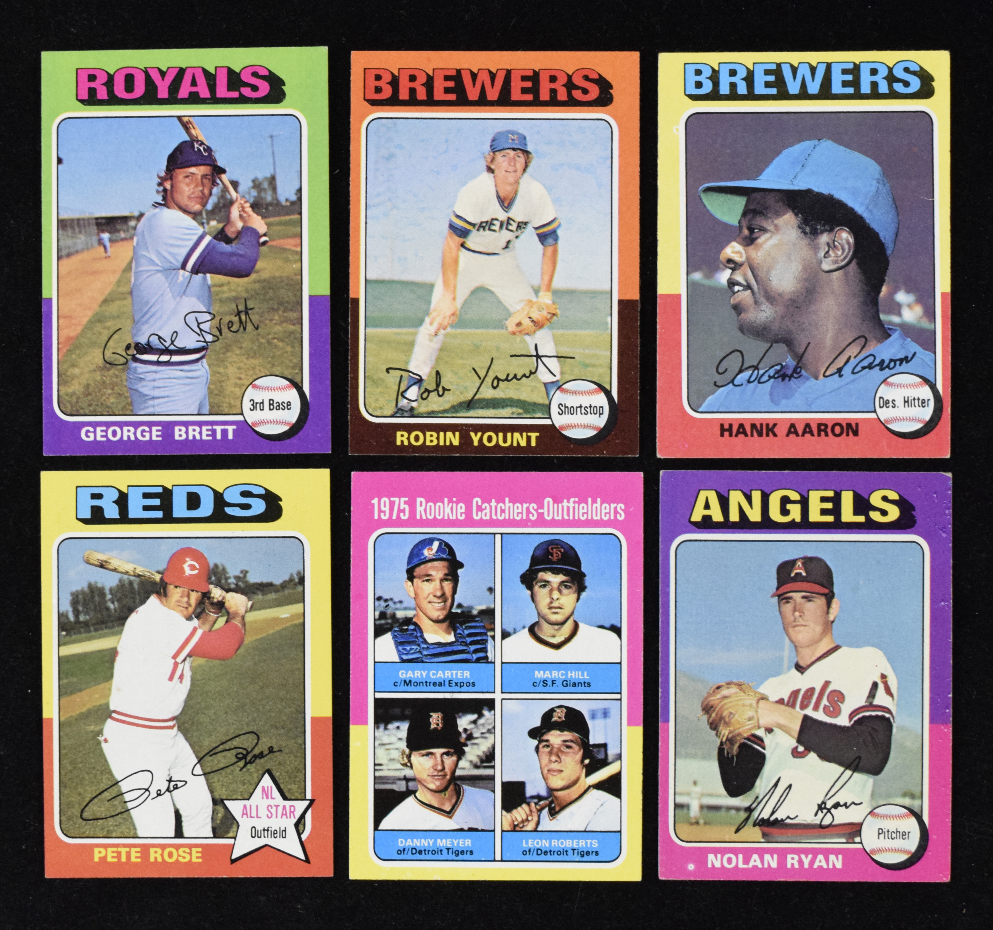 Description:"1975 Topps complete set (660) with Brett, Yount RCs and some in high grade (VG-NM). Mostly clean complete set of (660) cards is notable for its large selection of rookie cards of stars and Hall of Famers, including #s 223 Robin Yount (EX/MT), 228 George Brett (EX/MT), 616 Jim Rice (VG/EX), 620 Gary Carter (EX+), 622 Fred Lynn (EX) and 623 Keith Hernandez (EX/MT OC). Set also includes the MVP subset and many Hall of Famers, including #500 Nolan Ryan (VG/EX), 320 Pete Rose (EX/MT) and 660 Hank Aaron (VG). Balance of the set appears mostly EX/MT with some better and some worse. Range: VG-NM. "