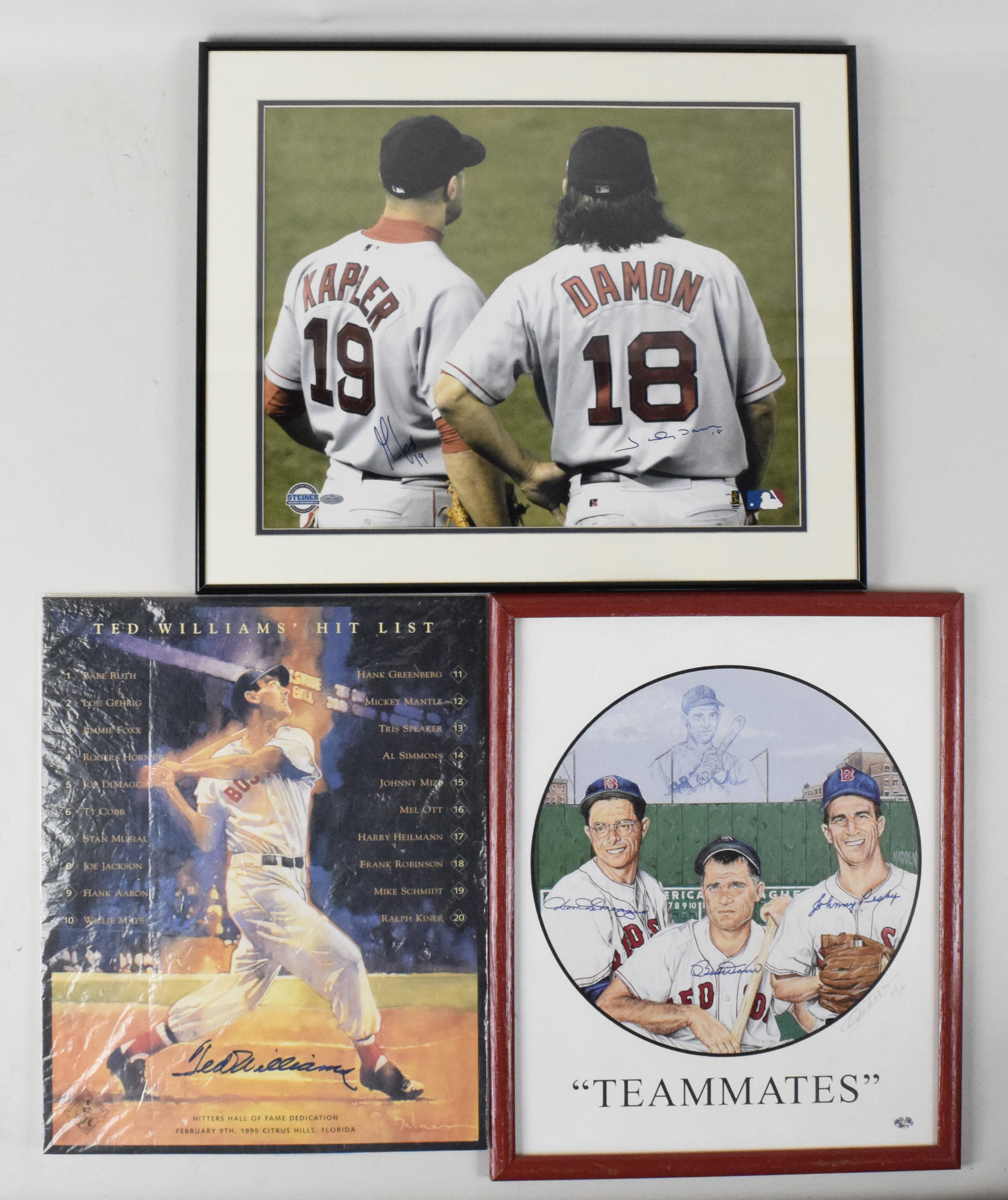 Description:"Lot of (7) Boston Red Sox autographed photos and prints, including Ted Williams, most framed (Sigs. NM/MT-MT). Sizes range from 8""x10"" to 20""x24,"" with most pieces framed. Pieces are individually signed by Ted Willaims Kevin Youkilis, Johnny Damon, Doug Mientkiewicz, Jason Varitek, Dom DiMaggio/Bobby Doerr/Johnny Pesky and Gabe Kapler/Johnny Damon. Signatures rate 8/9 out of 10 and items range EX-NM. "