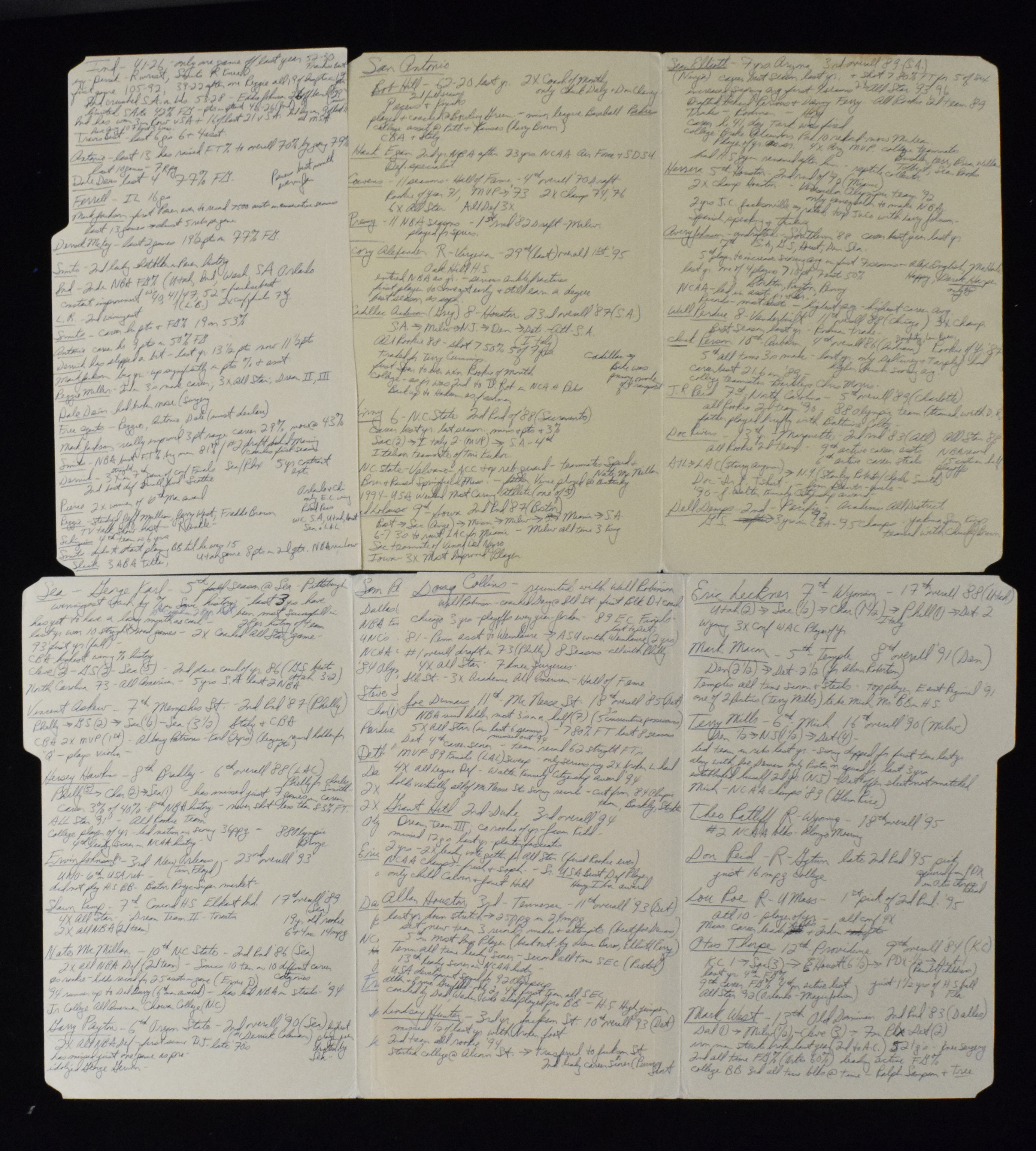 Description:Bill Walton's handwritten NBA team notes c.mid-late 1990s (VG/EX-EX/MT). Consists of (10) 9.5"x14.5" manila folder pages covered in notes on the Indiana Pacers (lengthy section on Reggie Miller), San Antonio Spurs (lengthy section on David Robinson), Orlando Magic, Seattle SuperSonics, Cleveland Cavaliers, Detroit Pistons, and Charlotte Hornets. Includes certificate of provenance from Walton Family: VG/EX-EX/MT