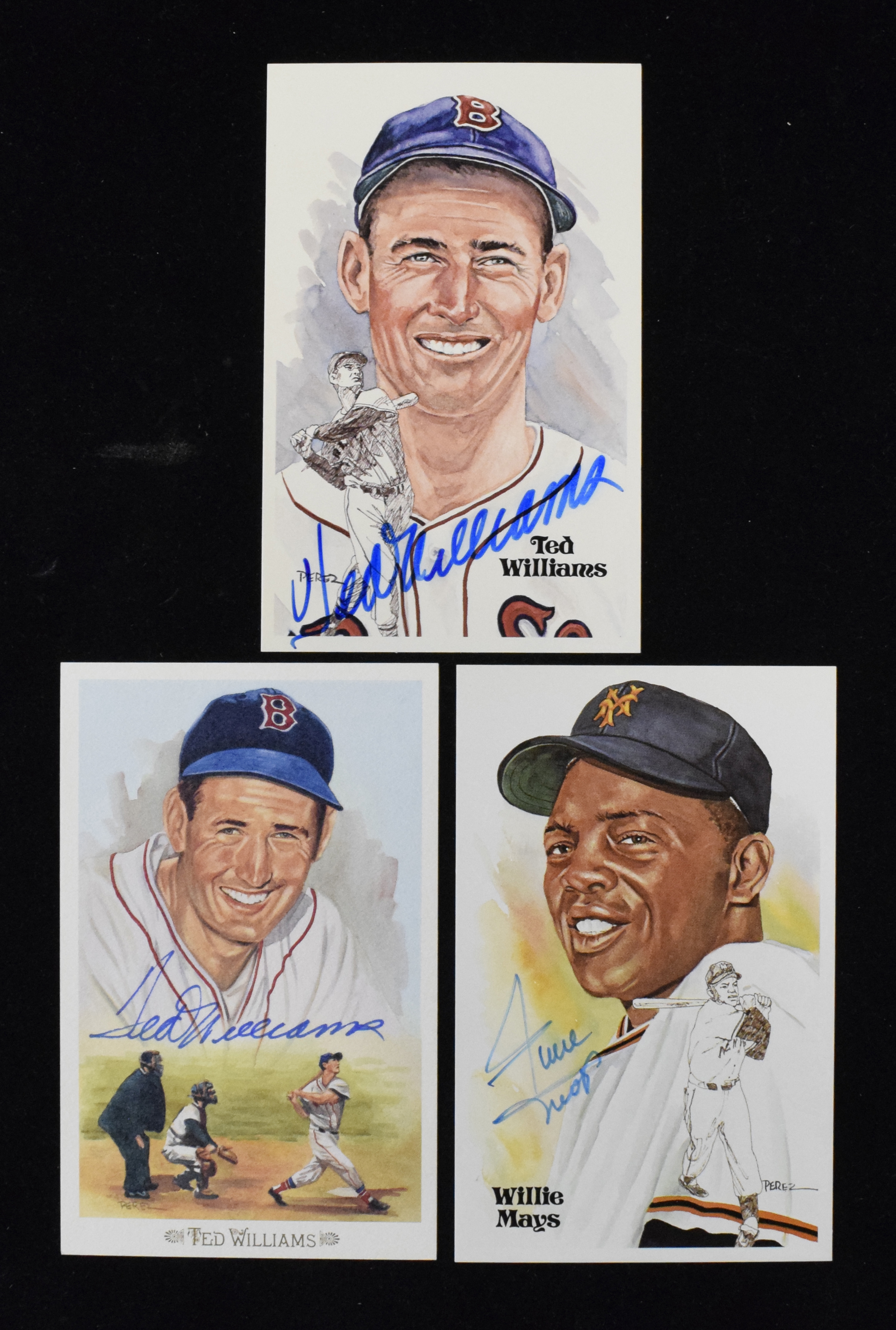 Description:"Lot of (3) autographed Perez-Steele postcards, with (2) Ted Williams and (1) Willie Mays (Sigs. NM/MT-MT). High-value assortment of signed postcards produced in the 1980s and 1990s by Perez-Steele Galleries. Includes (2) 1981, individually signed by Willie Mays and Ted Williams and (1) 1996 Celebration postcard signed by Ted Williams. Signatures rate 8/9 out of 10, and postcards range VG/EX-NM. "