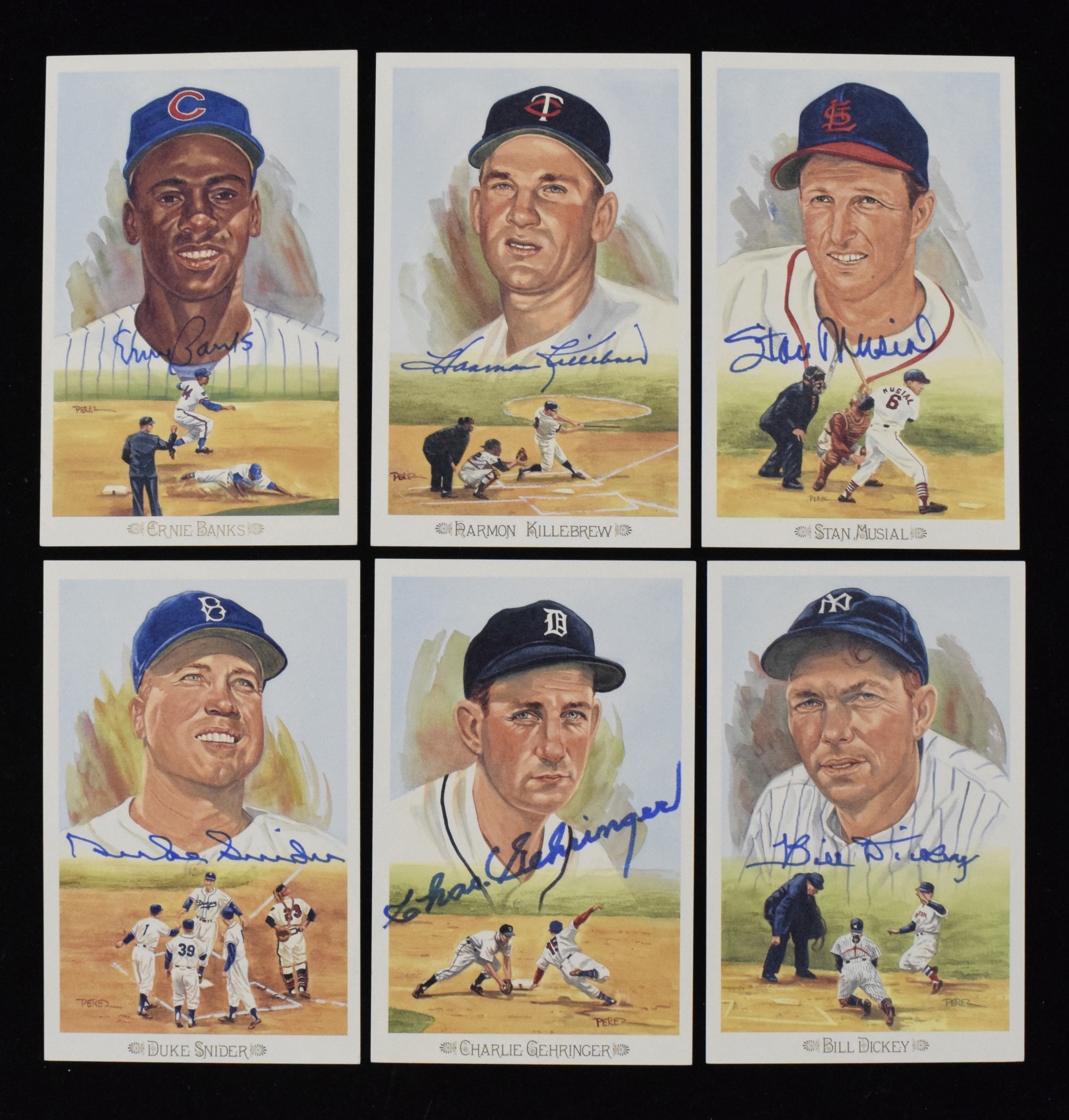 Description:"Lot of (37) autographed Perez-Steele Celebration postcards with Banks, Gehringer and Snider (Sigs. NM/MT-MT). Outstanding quantity from the popular Celebration series produced in 1989 by Perez-Steele Galleries, with duplication. Each card is individually signed by Pee Wee Reese, (2) Duke Snider, Juan Marichal, Stan Musial, Carl Yastrzemski, Lou Boudreau, (2) Bobby Doerr, Billy Herman, (2) George Kell, (2) Buck Leonard, (2) Enos Slaughter, Monte Irvin, Rick Ferrell, (2) Eddie Mathews, Warren Spahn, Joe Sewell, Ray Dandridge, Harmon Killebrew, Catfish Hunter, A.B. Chandler, (2) Johnny Mize, (2) Luis Aparicio, Willie Stargell, Brooks Robinson, Ralph Kiner, Bob Lemon, Charlie Gehringer, Bill Dickey and Ernie Banks. Signatures rate 8/9 out of 10, and postcards appear NM. "