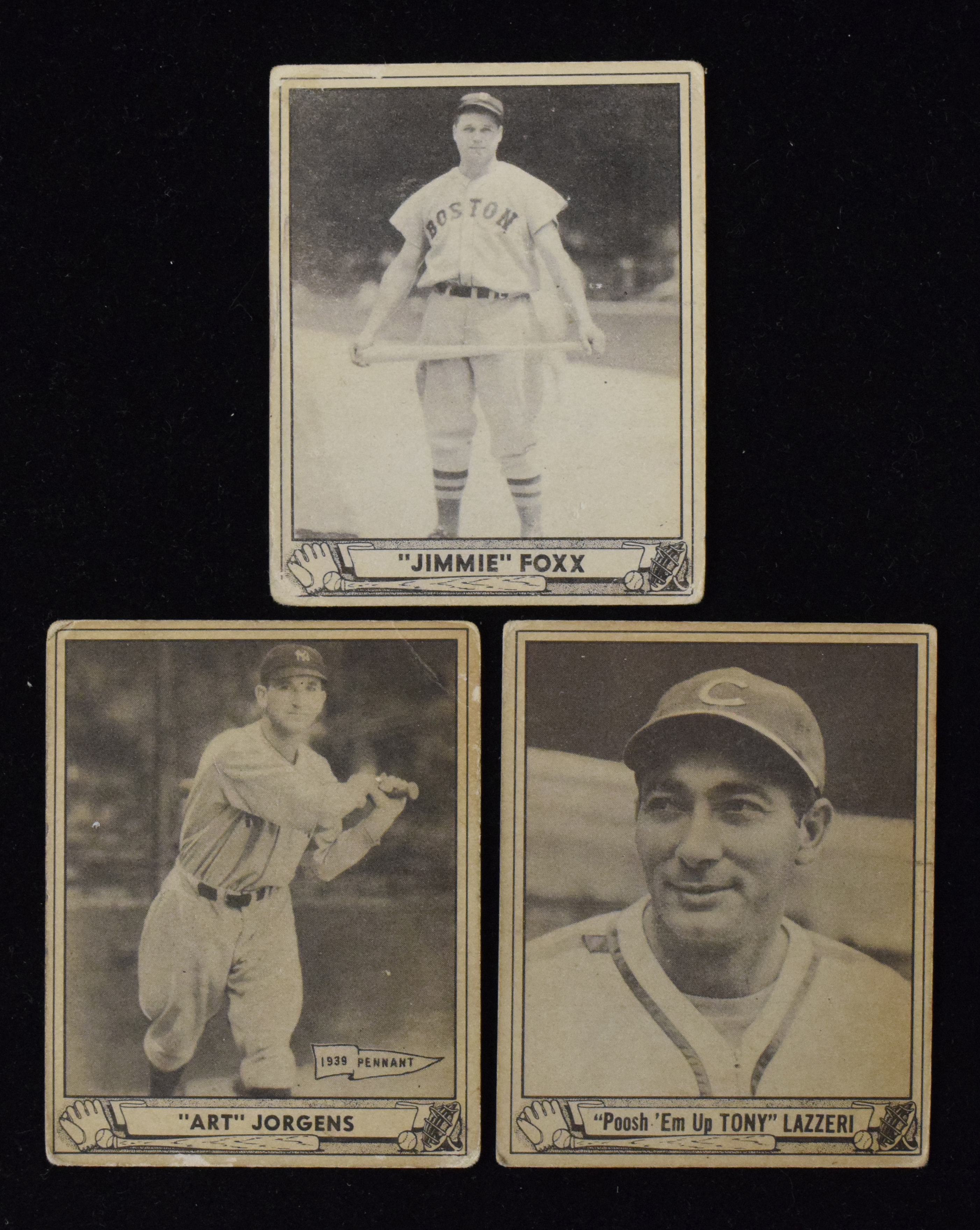 Description:"Lot of (3) 1940 Play Ball cards, including Jimmie Foxx and Tony Lazzeri (FR-VG). Lot includes #s 2 Art Jorgens (FR), 133 Jimmie Foxx (FR) and 238 Tony Lazzeri (VG). Backs of all three are relatively clean: FR-VG. "