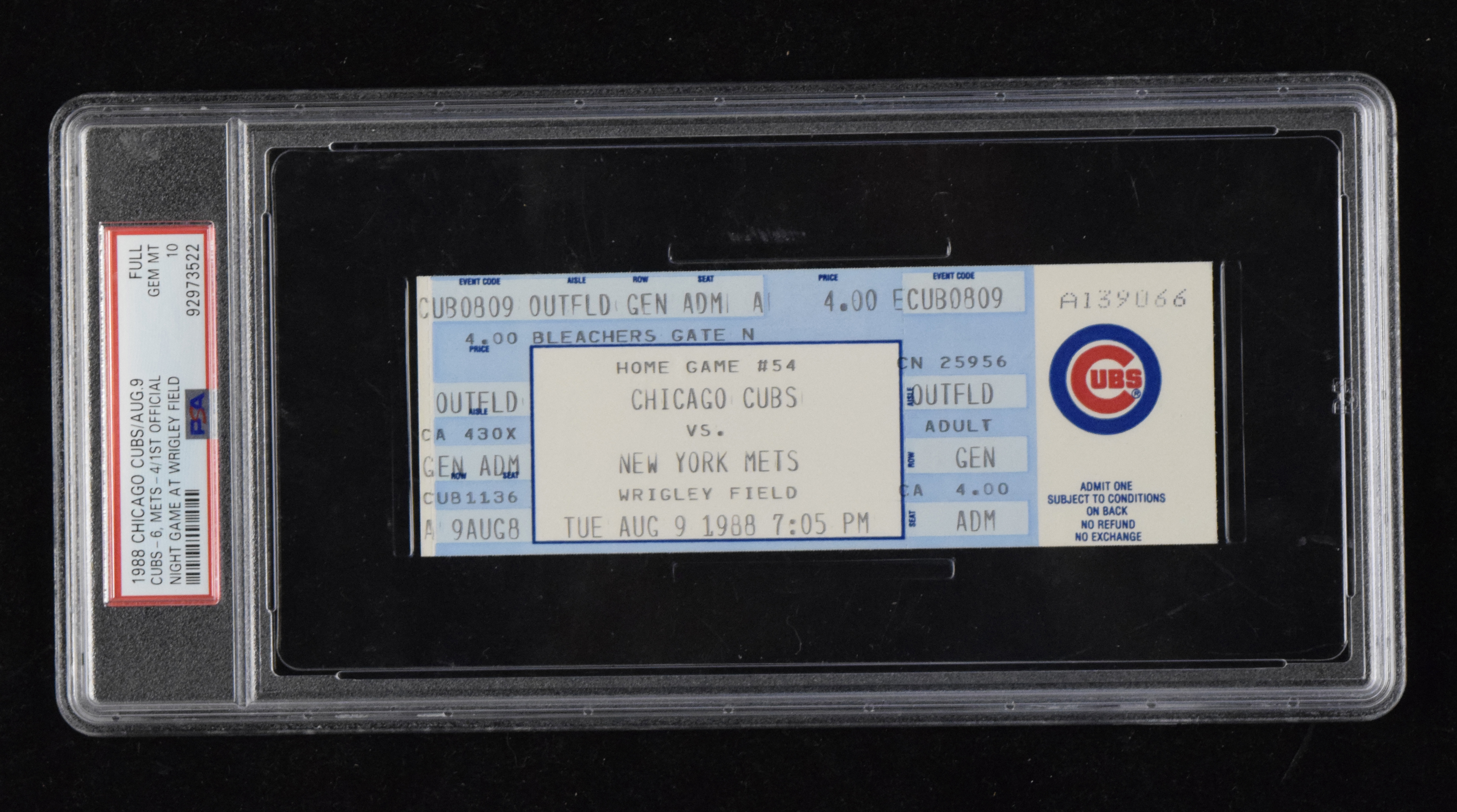 Description:1988 First Official Night Game at Wrigley Field full ticket graded PSA 10 - pop 2 (GEM MINT). August 9th full ticket for game in which the Chicago Cubs defeated the New York Mets by a score of 6-4. Encapsulated and graded PSA 10, with only one other 10 shown in their pop report: GEM MINT ($500-$1,000)