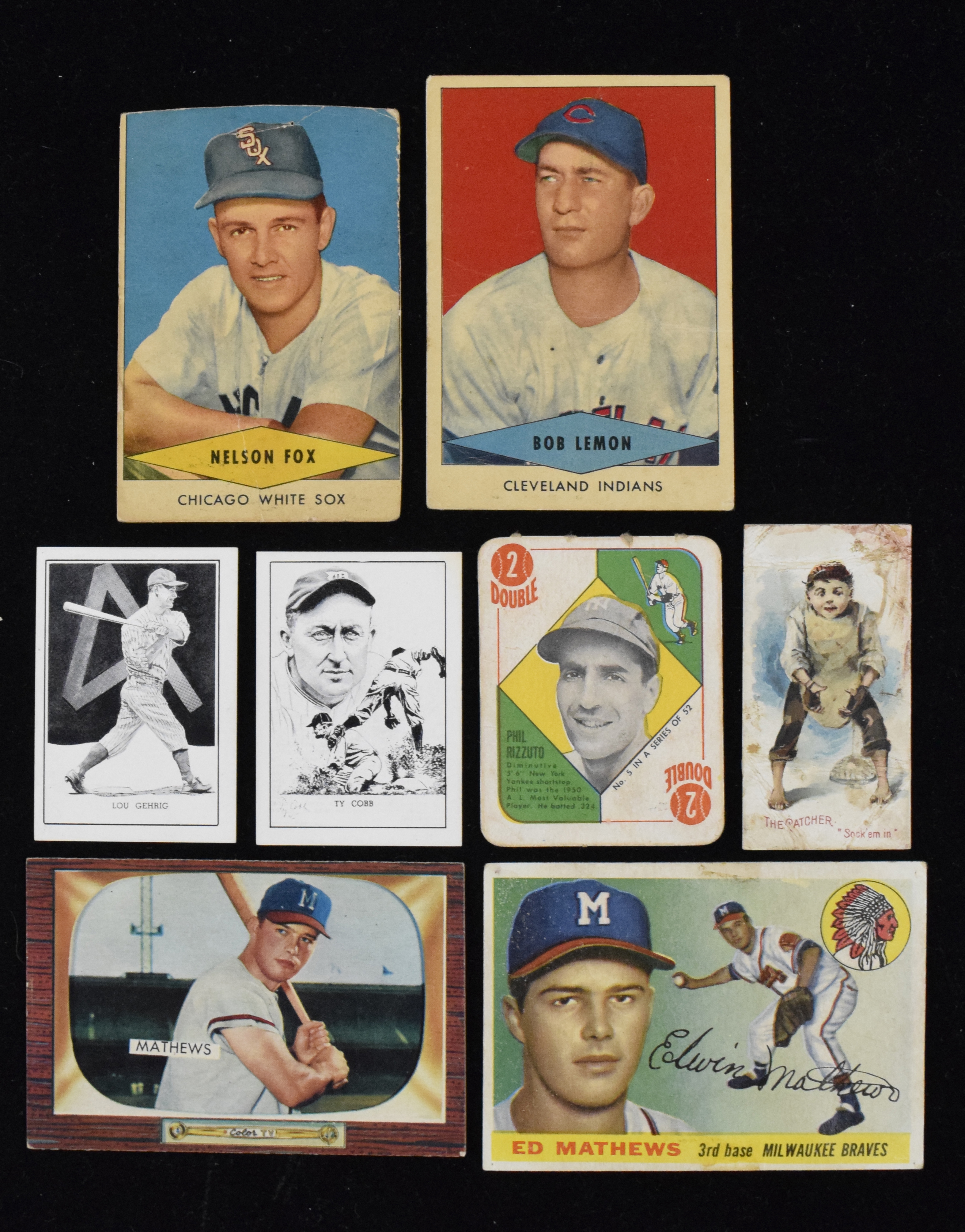 Description:"Lot of (12) 1888-1955 baseball cards with Hall of Famers and oddball (PR/Trimmed-EX/MT). Assortment of mostly low-grade vintage cards includes (1) 1889 N88 W. Duke & Sons Terrors of America The Catcher (PR); (2) 1950 Callahan: Ty Cobb and Lou Gehrig (EX/MT); (3) 1954 Red Heart Dog Food: Nellie Fox (heavily trimmed), Bob Lemon (PR) and Jim Hegan (VG); (2) 1951 Topps Red Backs: #s 5 Phil Rizzuto (GD) and 22 Bob Feller (PR); 1953 Topps #135 Al Rosen (PR); (2) 1955 Bowman: #s 103 Eddie Mathews (GD) and 171 Robin Roberts (PR) and 1955 Topps #155 Eddie Mathews (PR). Range: PR/Trimmed-EX/MT. "