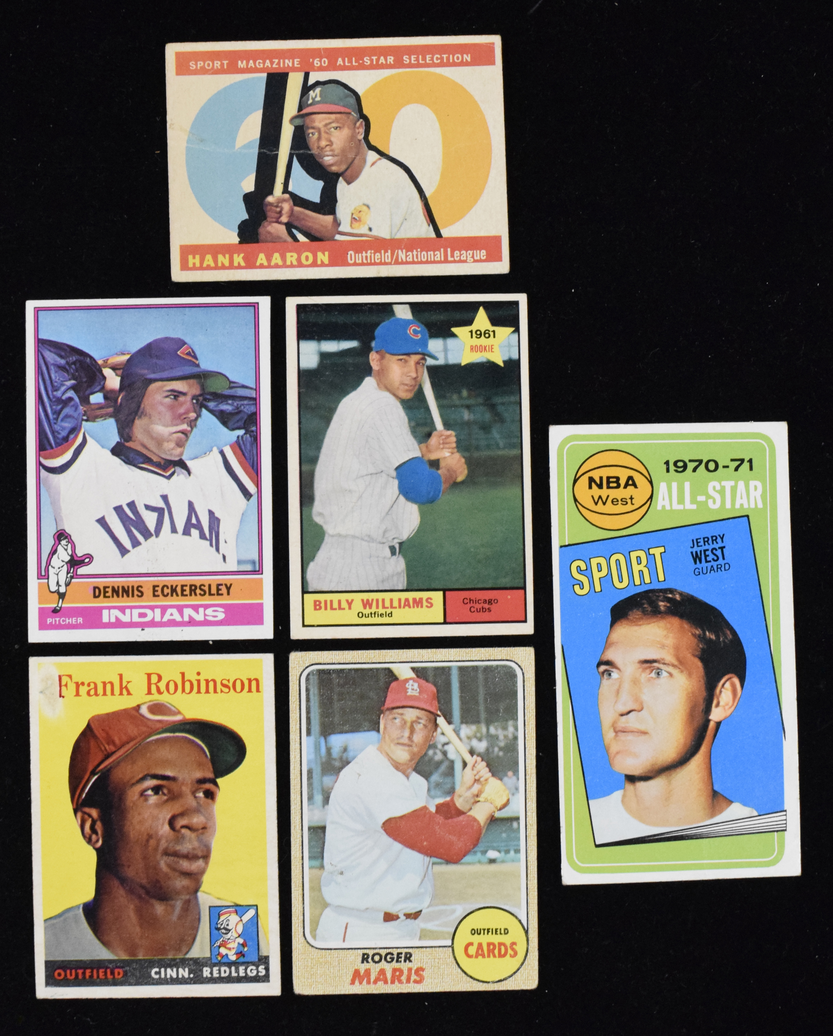 Description:"Lot of (23) 1960-1974 baseball and basketball cards with RCs and Hall of Famers (PR-EX). Lot includes (3) 1958 Topps cards, highlighted by 25 Don Drysdale and 285 Frank Robinson; (1) 1959 Topps #572; (1) 1960 Fleer: #42 Ty Cobb; (1) 1960 Topps #566 Hank Aaron AS; (2) 1961 Topps: #260 Don Drysdale and #141 Billy Williams RC; (1) 1962 Topps #350 Frank Robinson; (2) 1963 Topps: #s 345 Brooks Robinson and 1 Hank Aaron LDR; (2) 1965 Topps: #s 374 and 321 and (1) 1966 Topps #254 Fergie Jenkins RC; (1) 1967 Topps: #234 Sandy Koufax LDR; (2) 1968 Topps: #s 385 Catfish Hunter and 330 Roger Maris; (1) 1974 Topps: #80 Tom Seaver; (1) 1976 Topps: #98 Dennis Eckersley RC; (1) 1979 Topps: #116 Ozzie Smith RC; (1) 1978 Topps: #707 Paul Molitor/Alan Trammell RC and (2) 1970-71 Topps basketball cards: #107 Jerry West AS and 7 Bill Bradley. Most cards appear VG. Range: PR-EX. "