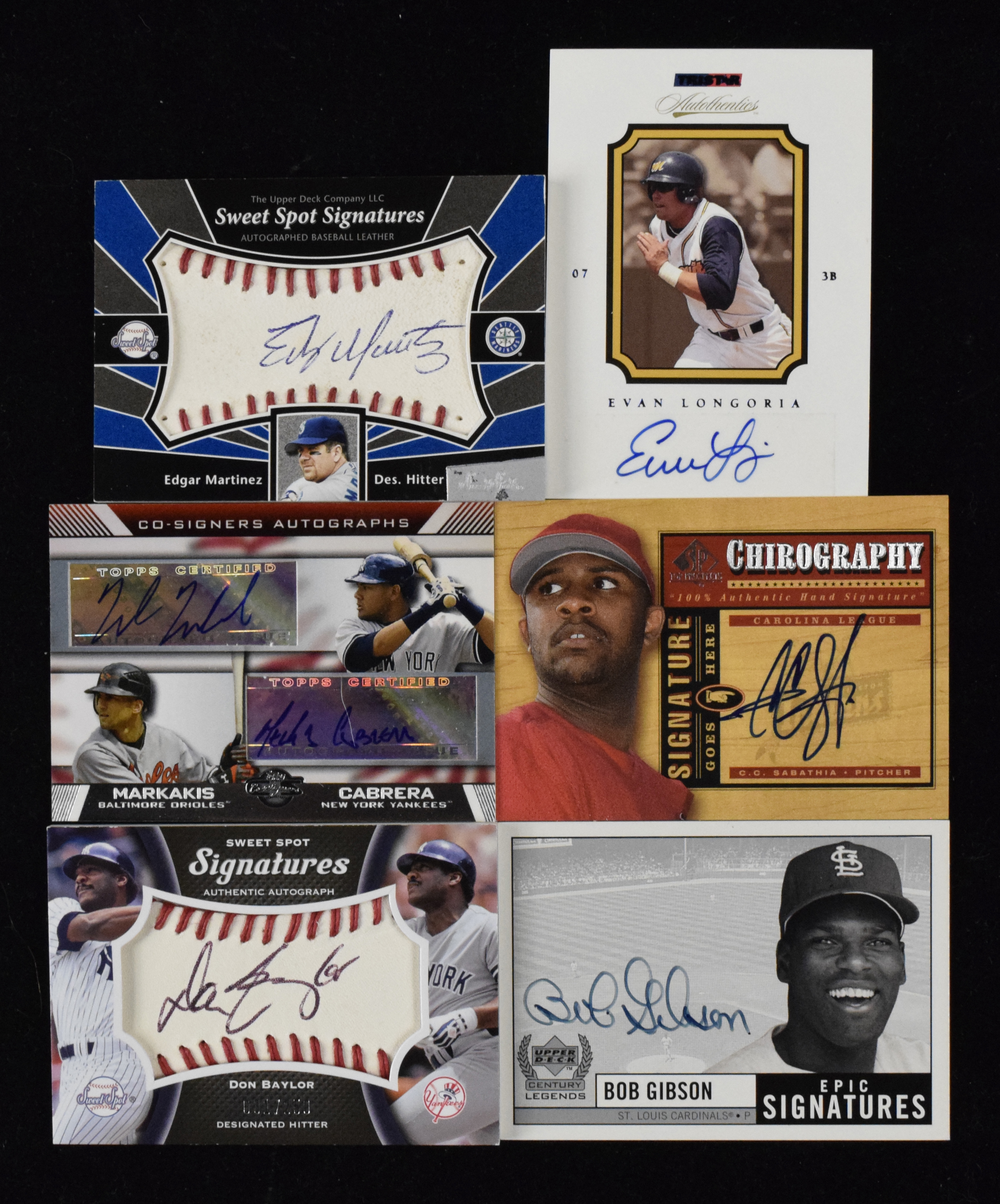 Description:"Lot of (11) modern certified autograph cards, including Sabathia, Gibson and Martinez (EX/MT-MT). Each card has been pulled from a pack from brands including Upper Deck, Topps, SP and others. Cards have been signed by Bob Gibson, Edgar Martinez, Carlos Lee, Hanley Ramirez, Don Baylor, Travis Hafner, Evan Longoria, Nick Markakis/Melky Cabrera, C.C. Sabathia, Xavier Nady and Adam Dunn. Signatures rate 9/10 out of 10, and cards range EX/MT-MT. "