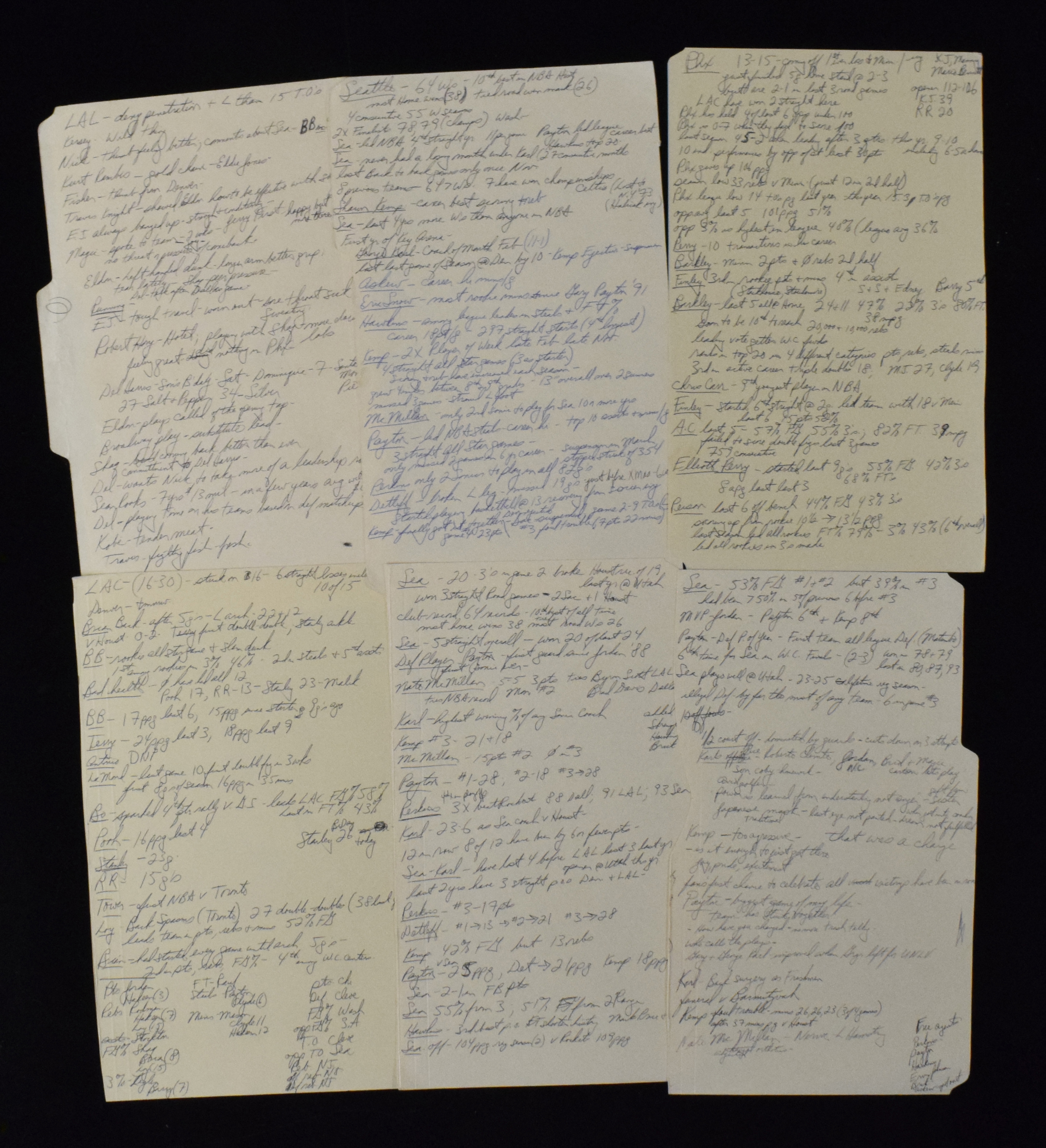 Description:Bill Walton's handwritten NBA team notes c.mid-late 1990s (VG/EX-EX/MT). Consists of (24) 9.5"x14.5" manila folder pages covered in notes on the Los Angeles Lakers (nice section on Magic Johnson), Seattle SuperSonics (many notes on Gary Payton), Portland Trail Blazers (many notes on Arvydas Sabonis), Phoenix Suns (many notes on Charles Barkley), Golden State Warriors, and Los Angeles Clippers. Includes certificate of provenance from Walton Family: VG/EX-EX/MT