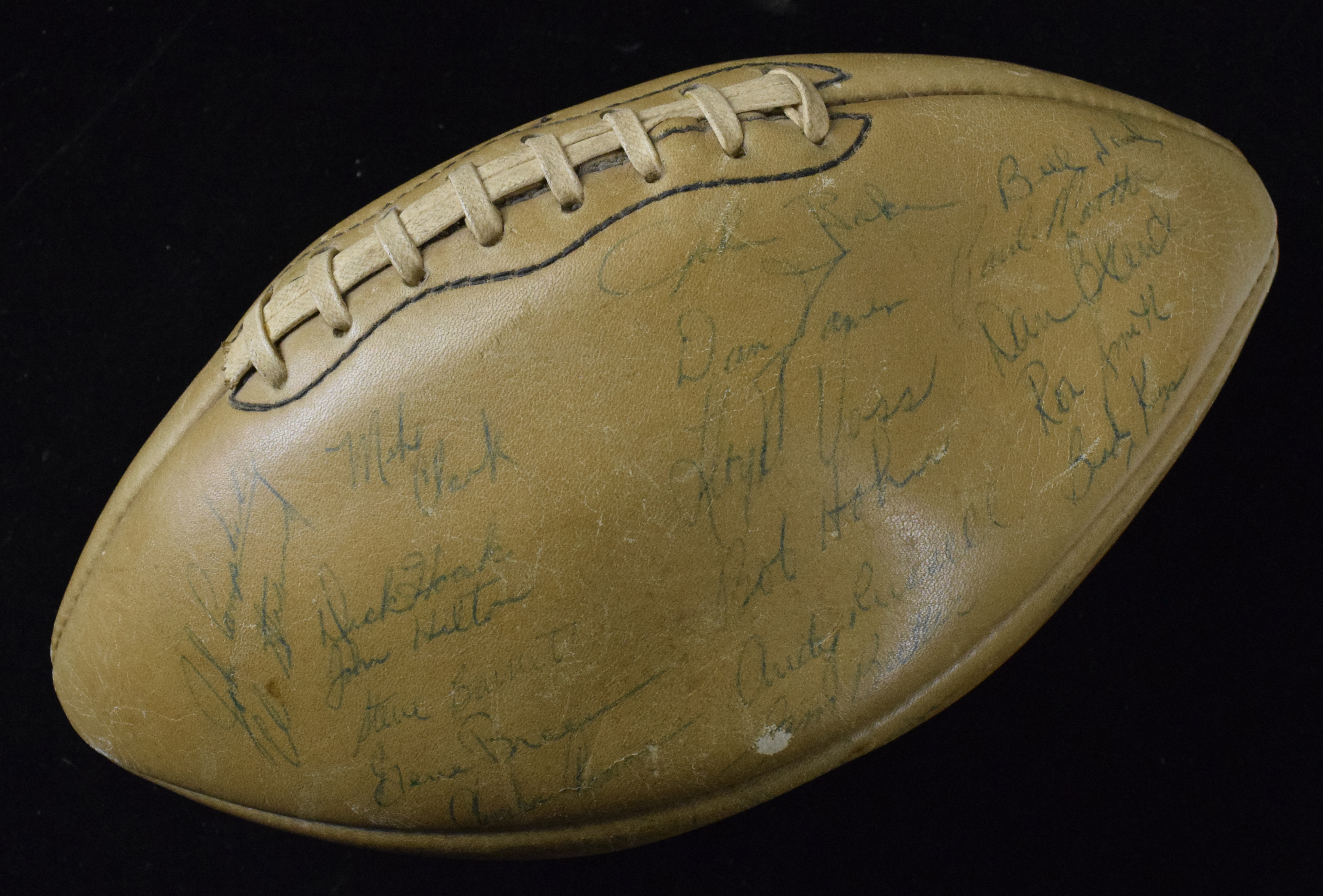 Description:"Pittsburgh Steelers autographed football with (40) signatures, c. 1966 (Sigs. avg. EX/MT-NM). Vintage Wilson football has been signed in blue ink by (40) members of the Steelers, including Andy Russell, Brady Keys, Ben McGee, Charlie Bradshaw, Ron Smith, Dick Hoak, Bill Asbury, Roy Jefferson, Larry Gagner, Chuck Hinton and others. Signatures range from 1 to 7 (avg 6/7) with the vast majority easily readable and a couple too faded to discern. Ball is mostly deflated and it is unknown if it will hold additional air: VG. "