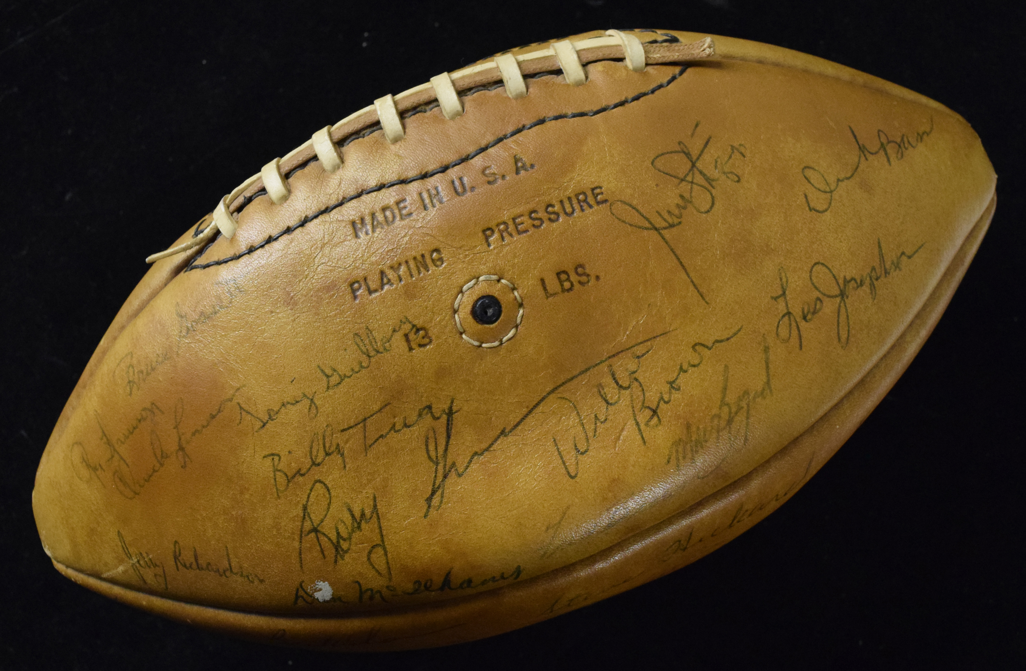 Description:"Los Angeles Rams autographed football with (40) signatures, c. 1966 (Sigs. avg. EX/MT-NM). Vintage Rawlings football has been signed in black ink by (40) members of the Rams, including Merlin Olsen, Deacon Jones, Roman Gabriel, Rosey Grier, Bruce Gossett, Willie Brown, Ron Smith, Don Chuy, Steve Heckard, Marlin McKeever, Joe Carollo, Jack Snow and others. Signatures range from 1 to 7 (avg 6/7) with the vast majority easily readable and several too faded to discern. Ball is deflated, has stiffened considerably and likely will not hold additional air: GD."