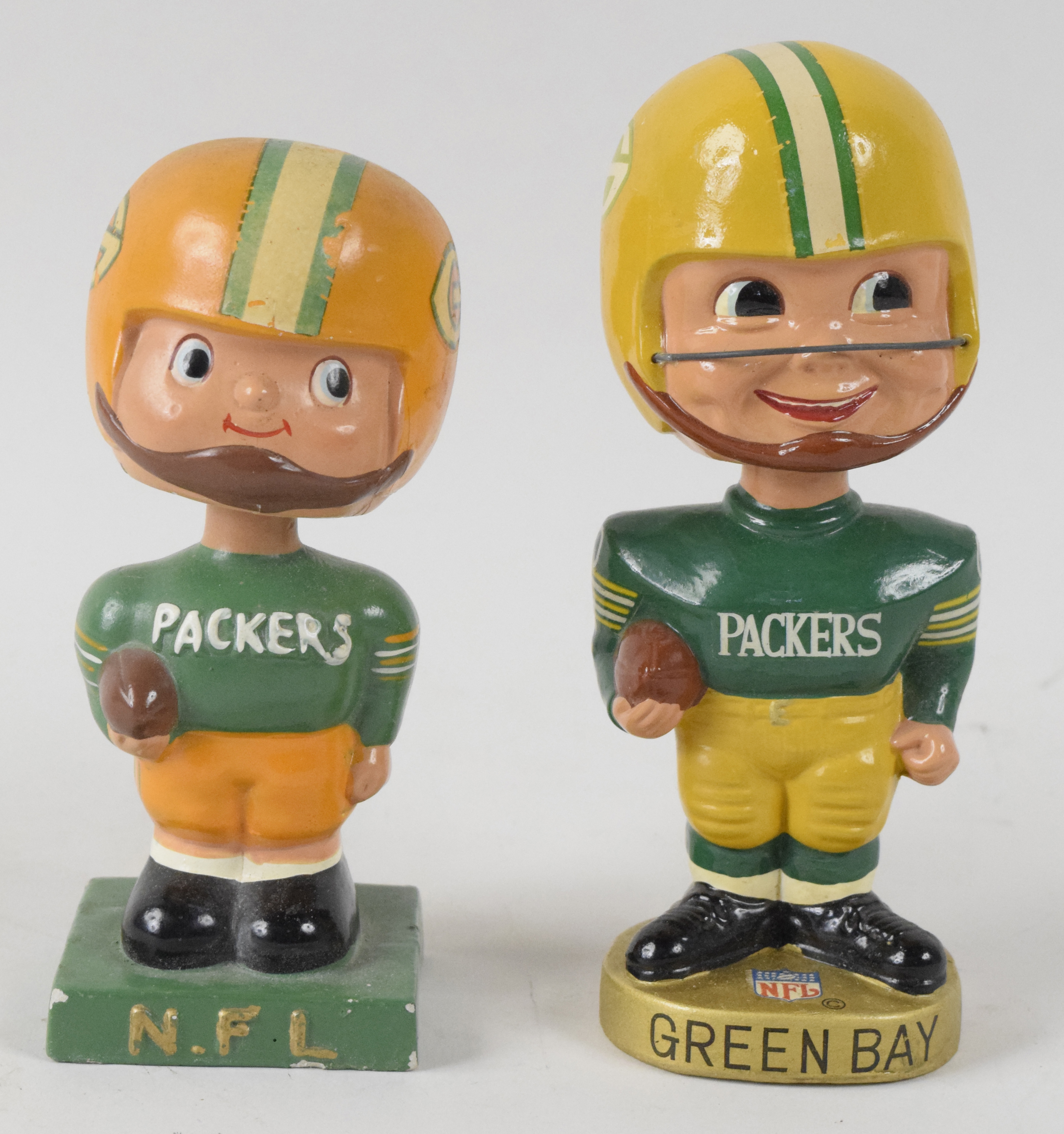 Description:"Lot of (2) Green Bay Packers nodders, c. 1960s (GD-EX/MT). Lot includes (1) with square, green base with ""NFL"" on the base (GD; chipping, paint loss and writing in marker on the underside of the base and (1) round, gold base with light paint loss (EX/MT). Range: GD-EX/MT. "