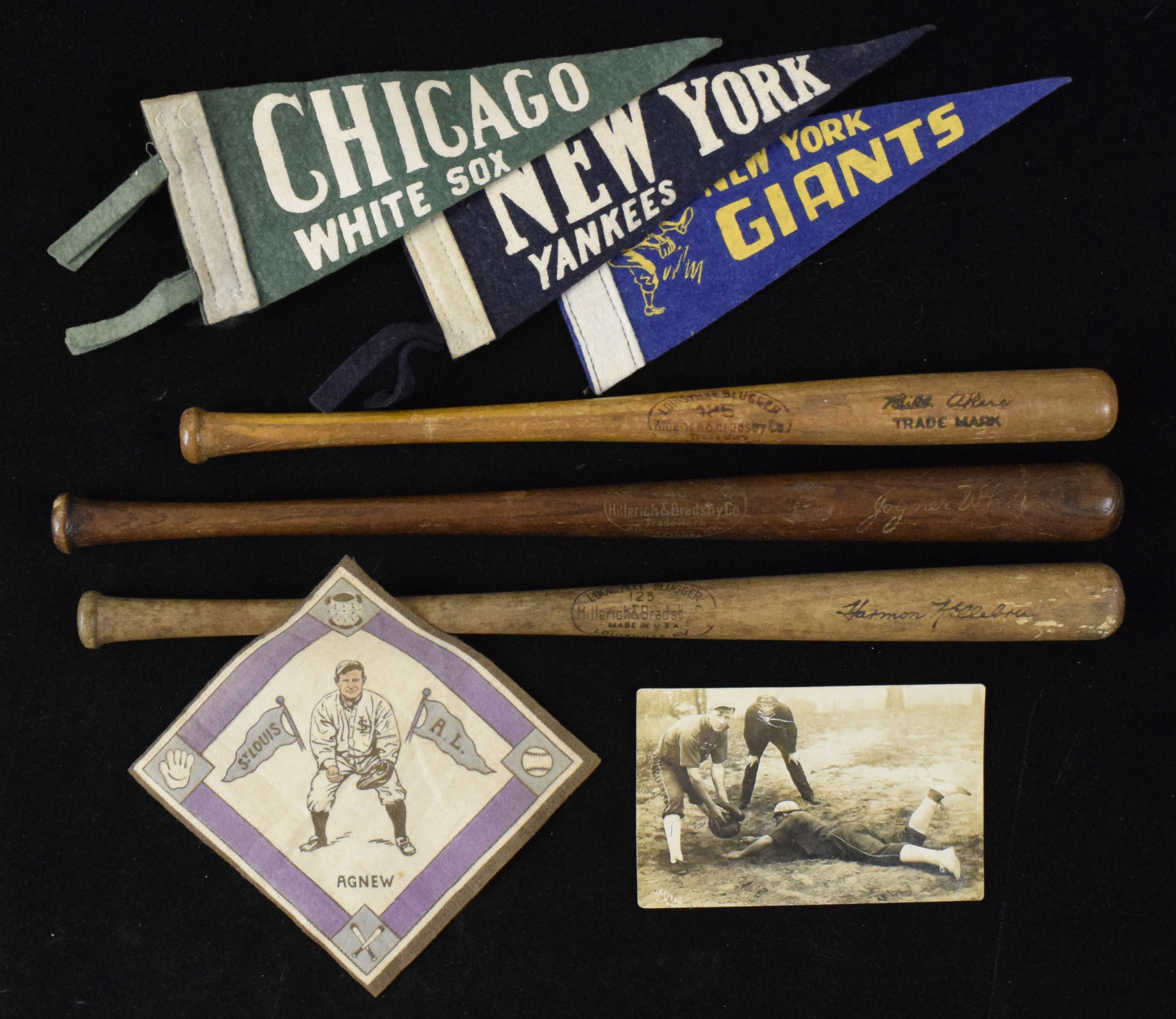 Description:"Small group of vintage baseball memorabilia, including photo, mini-bats & pennants, c. 1910s-50s (PR-EX). Lot includes (3) Louisville Slugger mini-bats: Joyner White, Harmon Killebrew and Bill Akers; (3) 8 1/2"" mini-pennants: New York Giants, New York Yankees and Chicago White Sox; (1) c. 1920s baseball real photo postcard (name written in ink on reverse) and (1) 1914 B18 Blankets Sam Agnew (purple variation). Range all items: PR-EX. "
