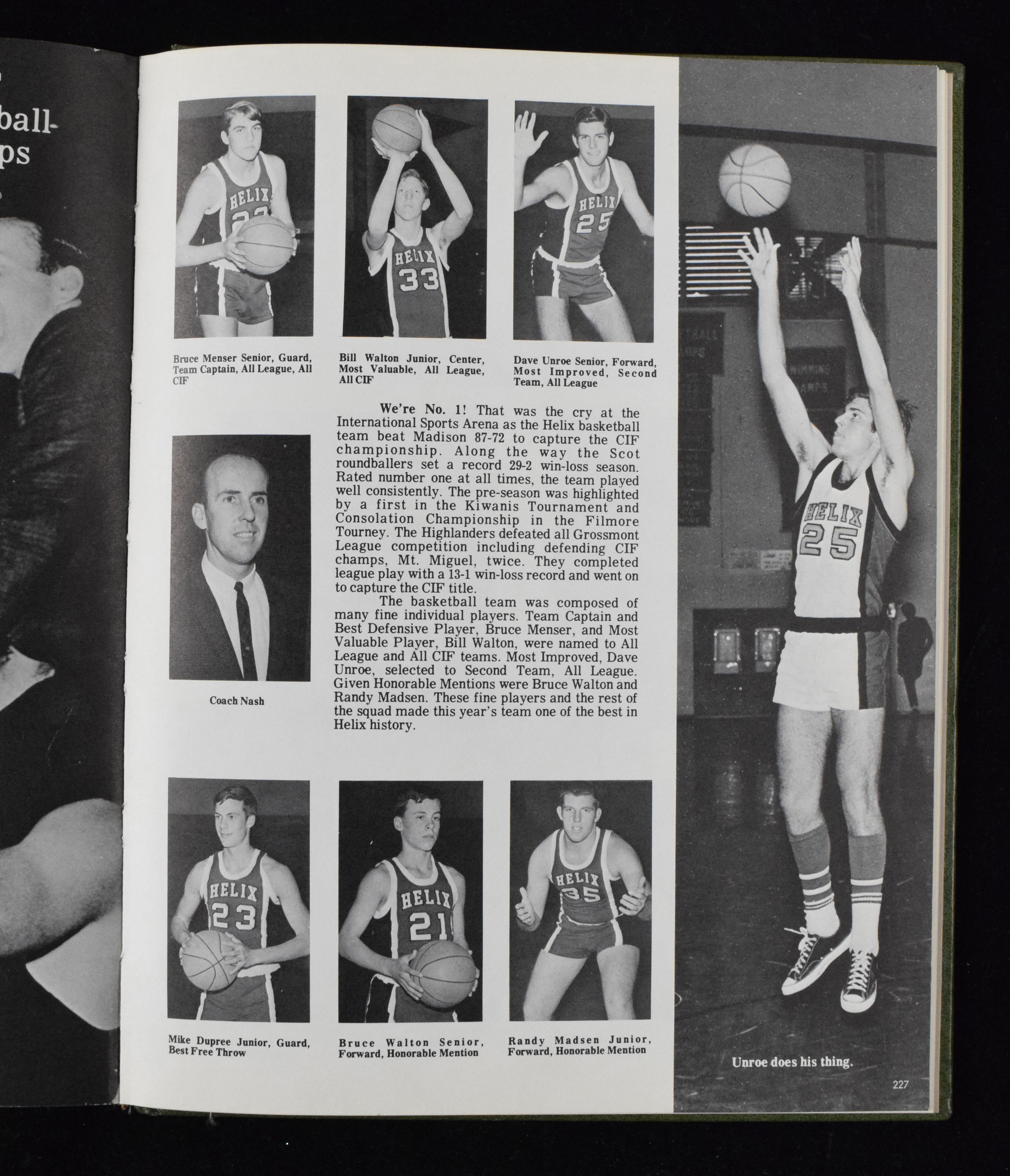 Description:Bill Walton's 1969 Helix High School yearbook (EX/MT). 248-page hardcover 1969 "Tartan" picturing Walton as a junior, and highlighted in the basketball section as ""Most Valuable, All League, All CIF"". Includes certificate of provenance from Walton Family: EX/MT