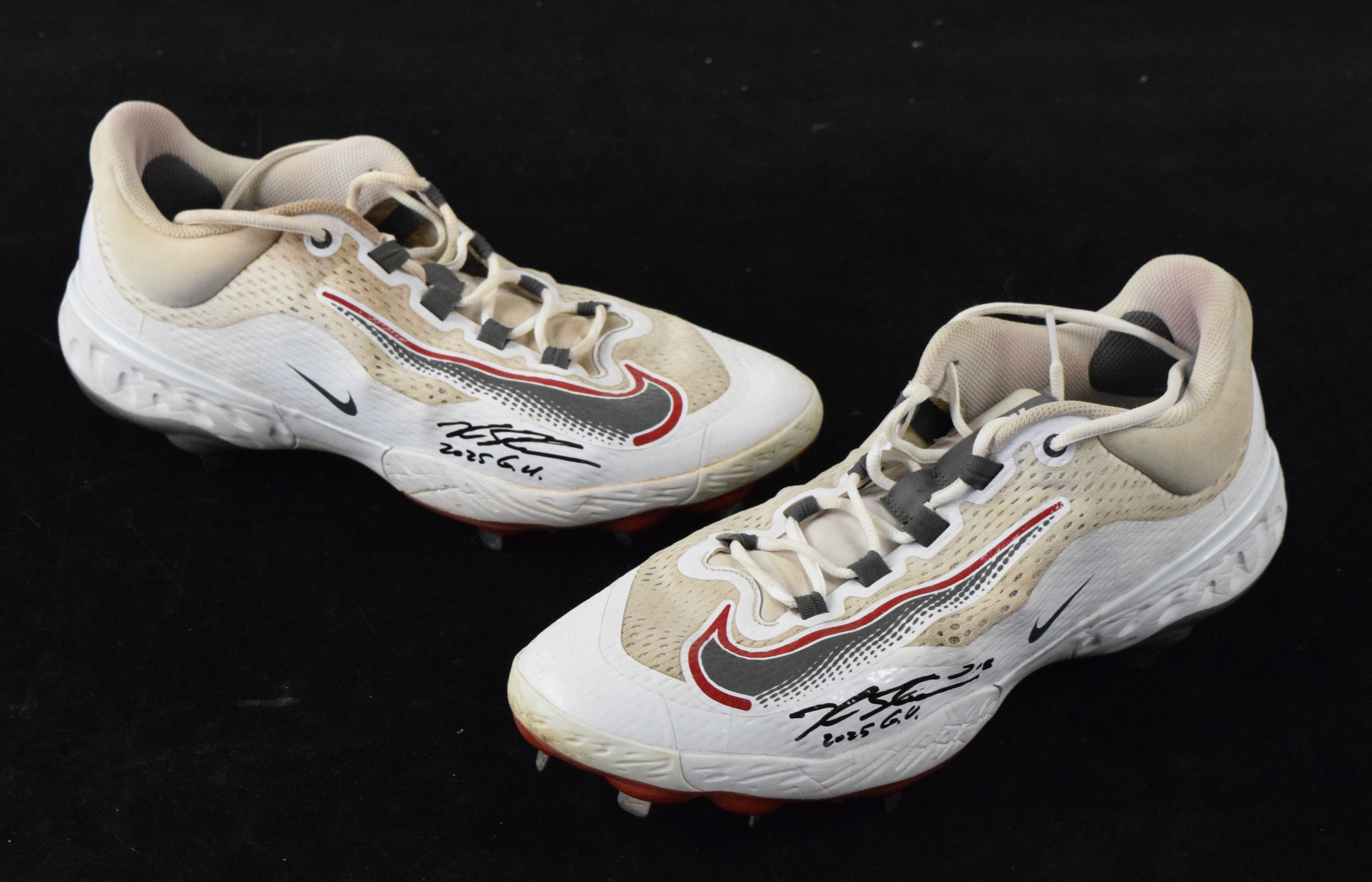 Description:Kyle Schwarber signed and inscribed 2025 game worn baseball cleats (EX-EX/MT). Nike size 14 spikes with ""MTL SCHWRBR P"" code on the interior tags, and Liberty Bell logo on both heels. Schwarber signed the side of each shoe in black marker and added ""2025 GU"" inscription to both. Signatures rate 9 to 9/10 out of 10. Hunt Auctions serial #ed hologram sticker is on the back of each cleat. Impressive use, with stained tongues, and light dirt stains around the bottoms: EX-EX/MT ($1,000-$2,000)