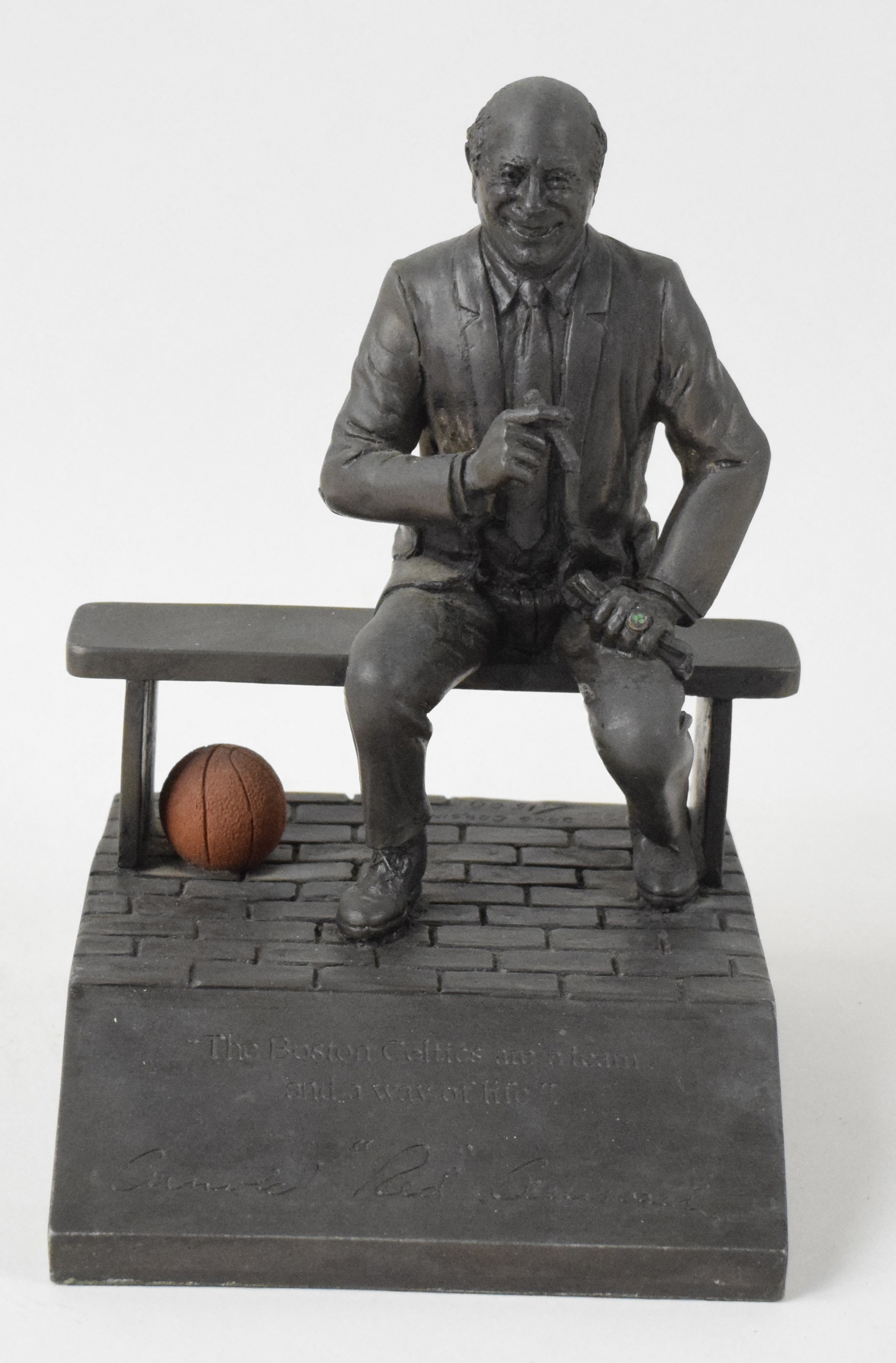 Description:Bill Walton's limited edition Red Auerbach statue (NM). Royal Tara statue by Doug Corsini measures 8" tall on 5"x5.5" base and depicts Auerbach sitting on a bench with cigar in hand. Numbered 292/1500. Includes certificate of provenance from Walton Family: NM