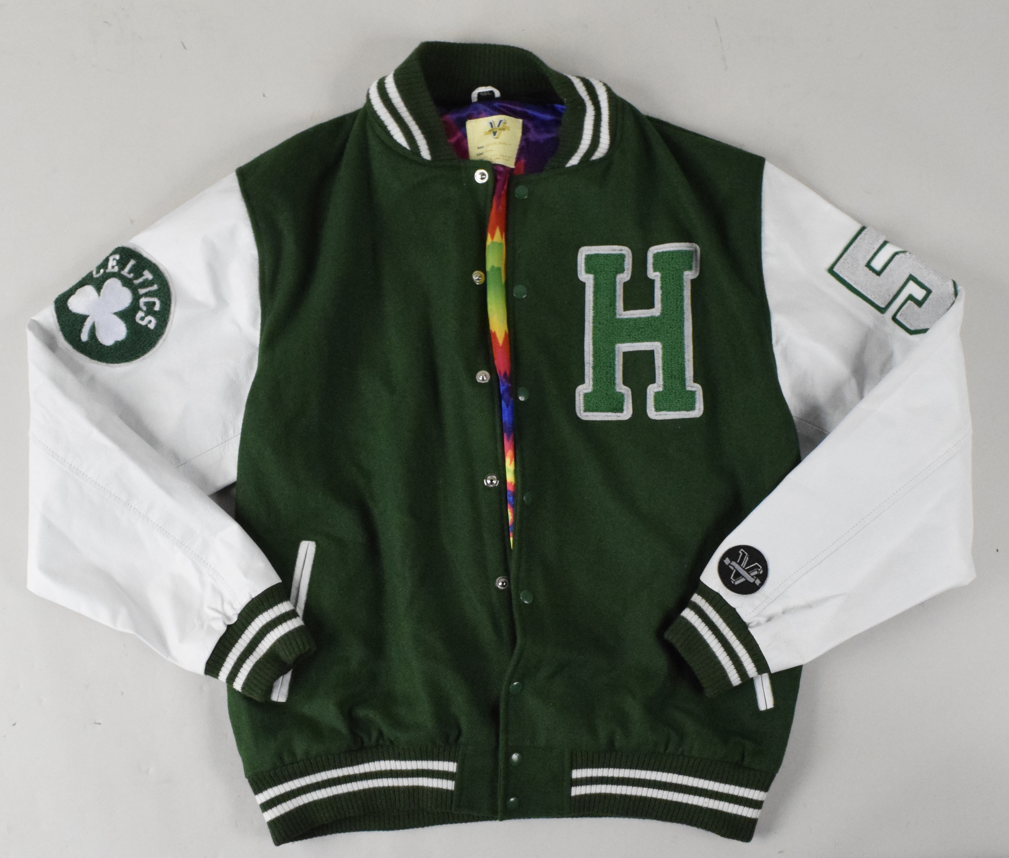 Description:Bill Walton's combination Helix High School / Boston Celtics / Grateful Dead letterman style jacket with related photo (EX/MT). Varsity Made size 4XL jacket with "H" Helix patch on the front, Celtics patch on the right sleeve and #5 on the left sleeve, along with tie-dye Grateful Dead style interior. Includes 8.5"x11" printed off photo picturing Walton wearing the jacket, and certificate of provenance from Walton Family: EX/MT