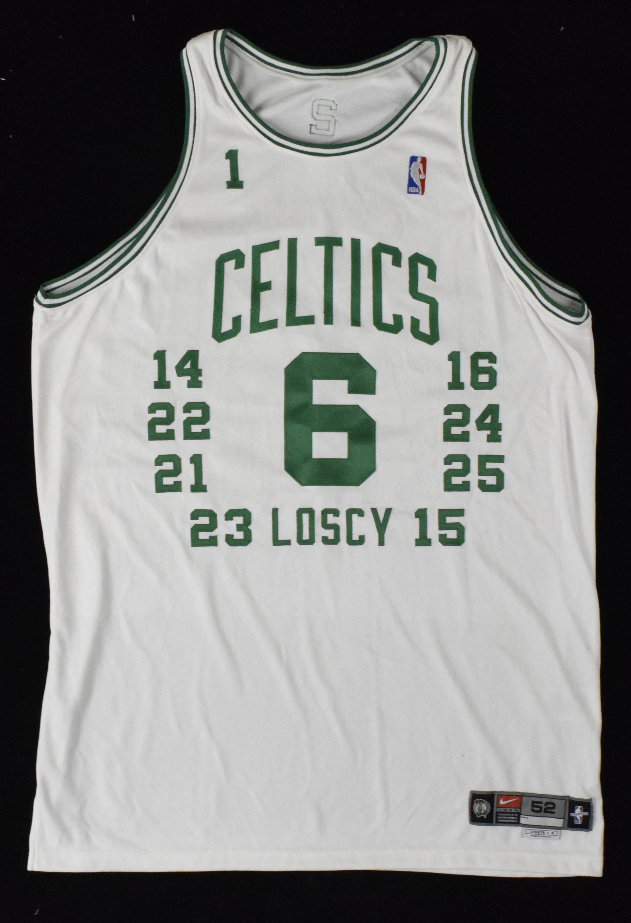 Description:Bill Walton's Celtics Pride commemorative jersey (EX/MT). Nike NBA Authentics size 52 jersey with the front and back covered by all the numbers that have been retired by the Boston Celtics. Includes certificate of provenance from Walton Family: EX/MT