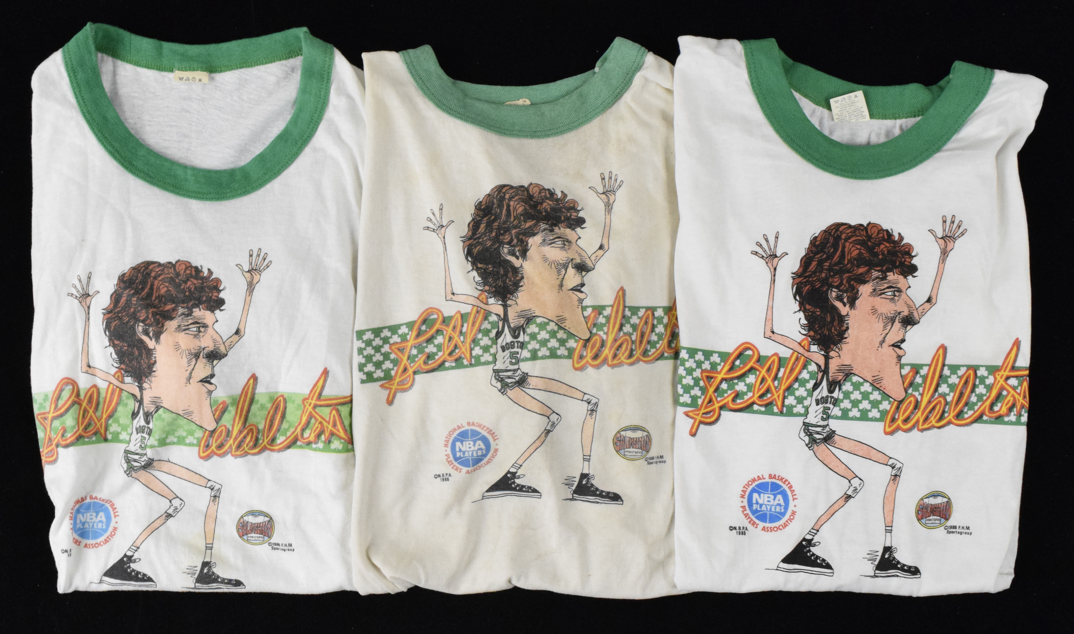 Description:Lot of (3) 1986 Bill Walton vintage t-shirts (EX-NM). Screen Stars size M (light wear), size L (stains), and size XL (possibly unworn) Bill Walton caricature style t-shirts. Includes certificate of provenance from Walton Family: EX-NM