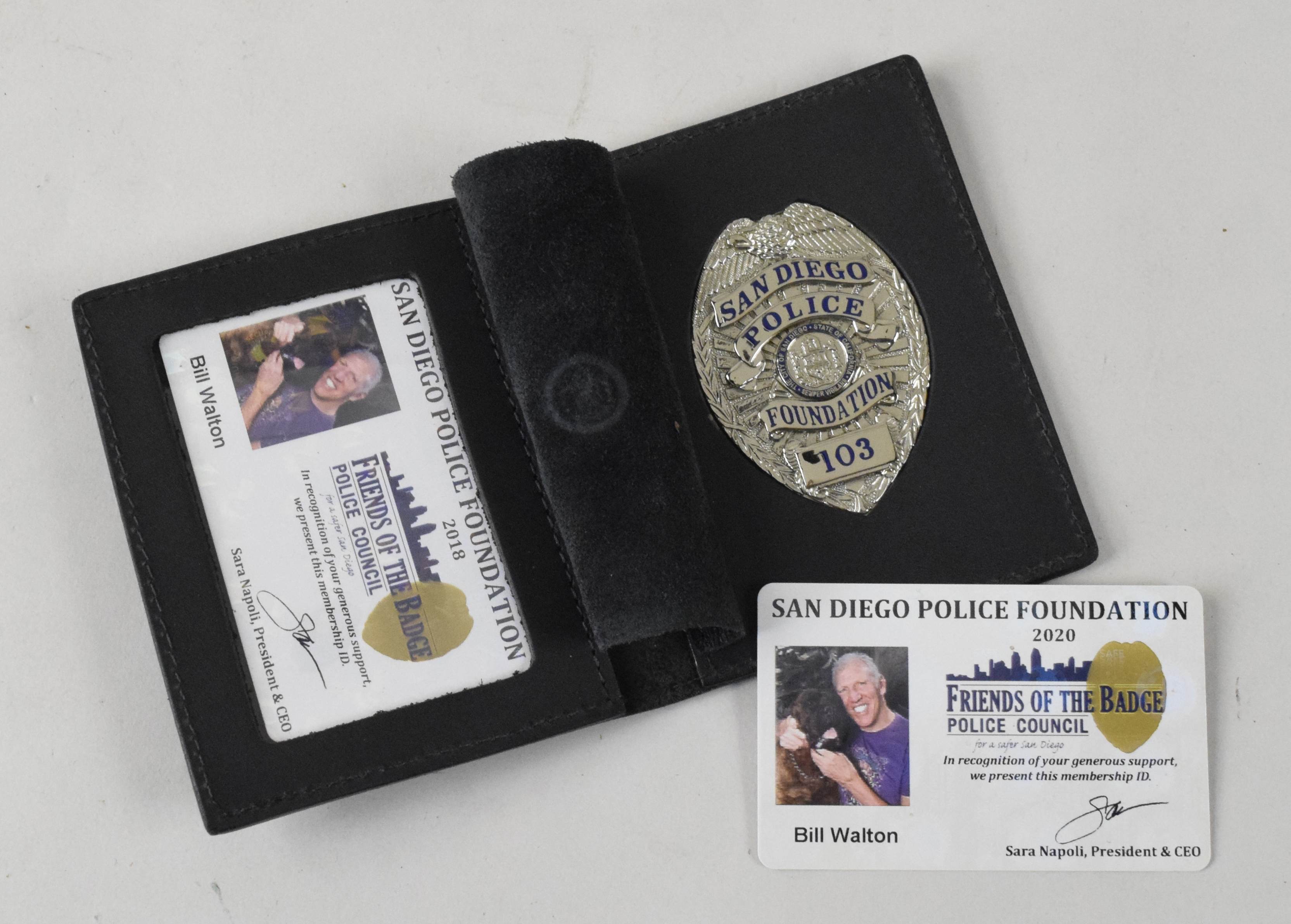 Description:Bill Walton's San Diego Police Foundation badge with 2018 and 2020 ID cards (NM-NM/MT). Includes the badge in leather folder with 2018 ID card, and loose 2020 ID card, as well as certificate of provenance from Walton Family: NM-NM/MT