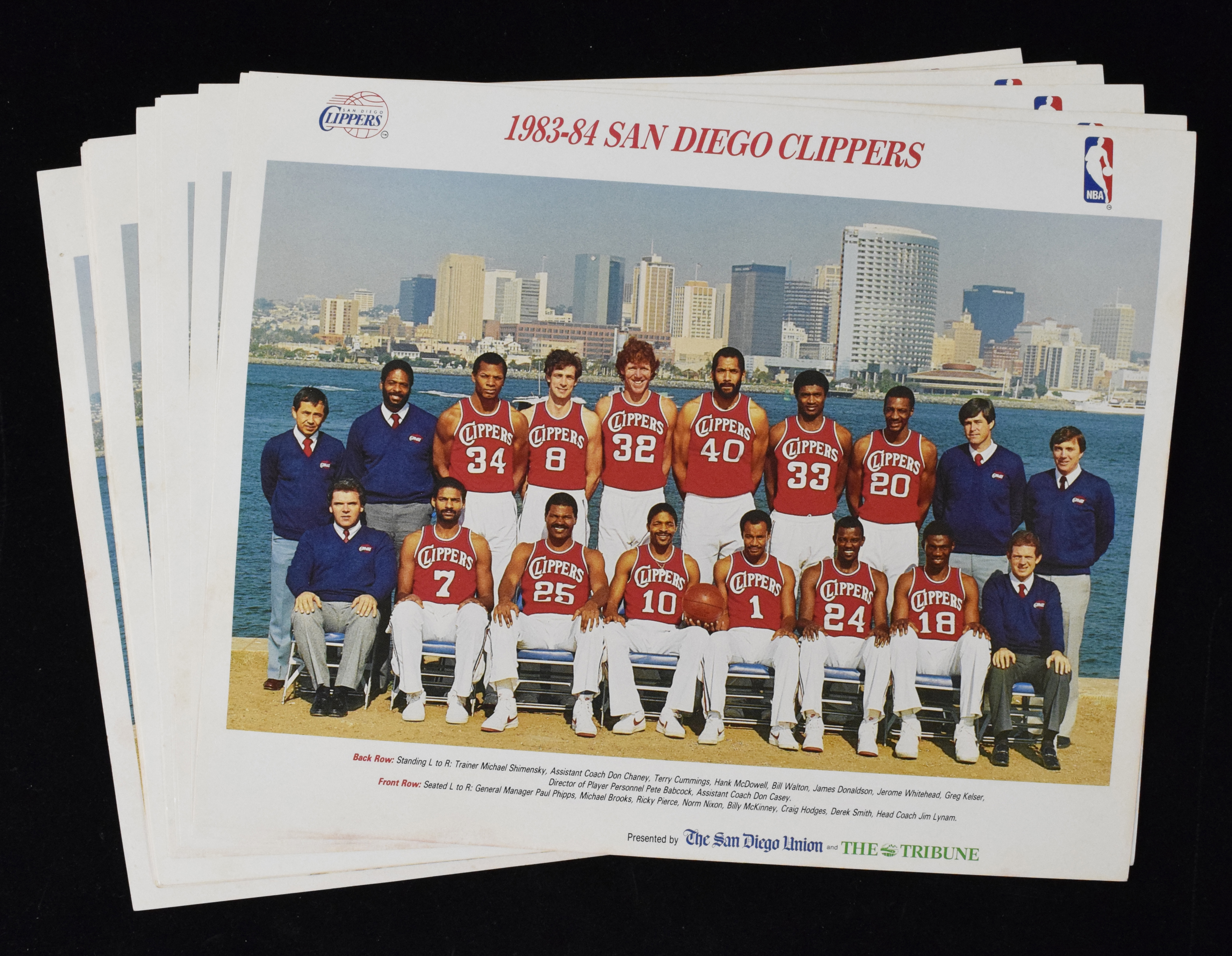 Description:Lot of (14) 1983-84 San Diego Clippers team photo premiums (VG-EX/MT). Thick paper photos measuring 11.25"x14" with Bill Walton pictured in the back row. Most appear to average VG/EX overall manly due to edge stains. Includes certificate of provenance from Walton Family: VG-EX/MT