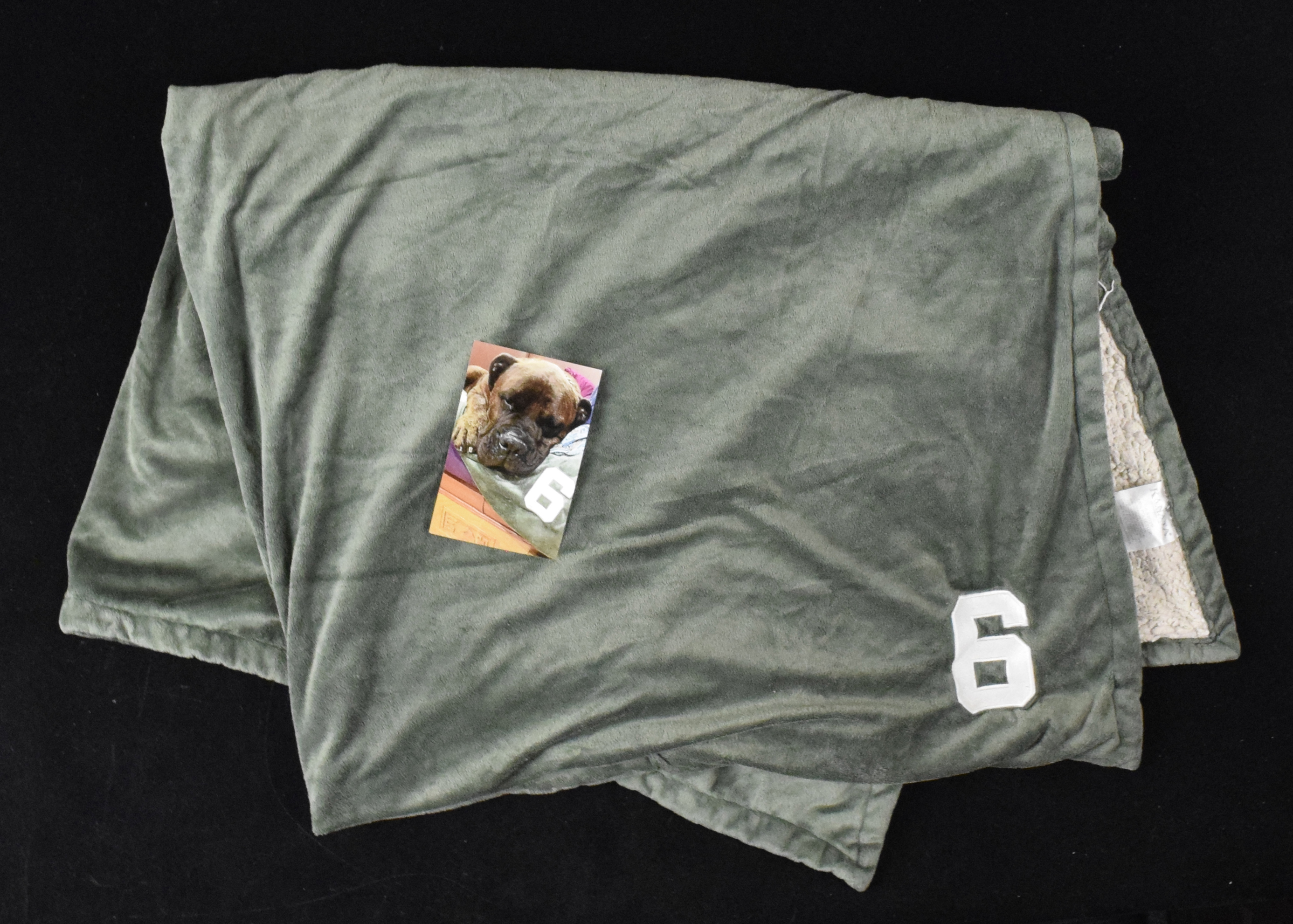 Description:Bill Russell blanket from 2013 statue dedication with related photograph (EX). Green blanket with #6 at the corner. Includes a sheet of paper with "Bill Russell Blanket from Statue Dedication" written in black marker, along with a photo picturing Walton's dog on the blanket. On the back of the photo, Walton's wife wrote: "I always tell people that our dog Cortez was pretty much Bill with fur :) We had 10 dogs during our marriage but Cortez was the one who captured Bill's heart + soul like no other. Lori Walton" (also comes with newspaper clipping of the statue dedication). Includes certificate of provenance from Walton Family: EX