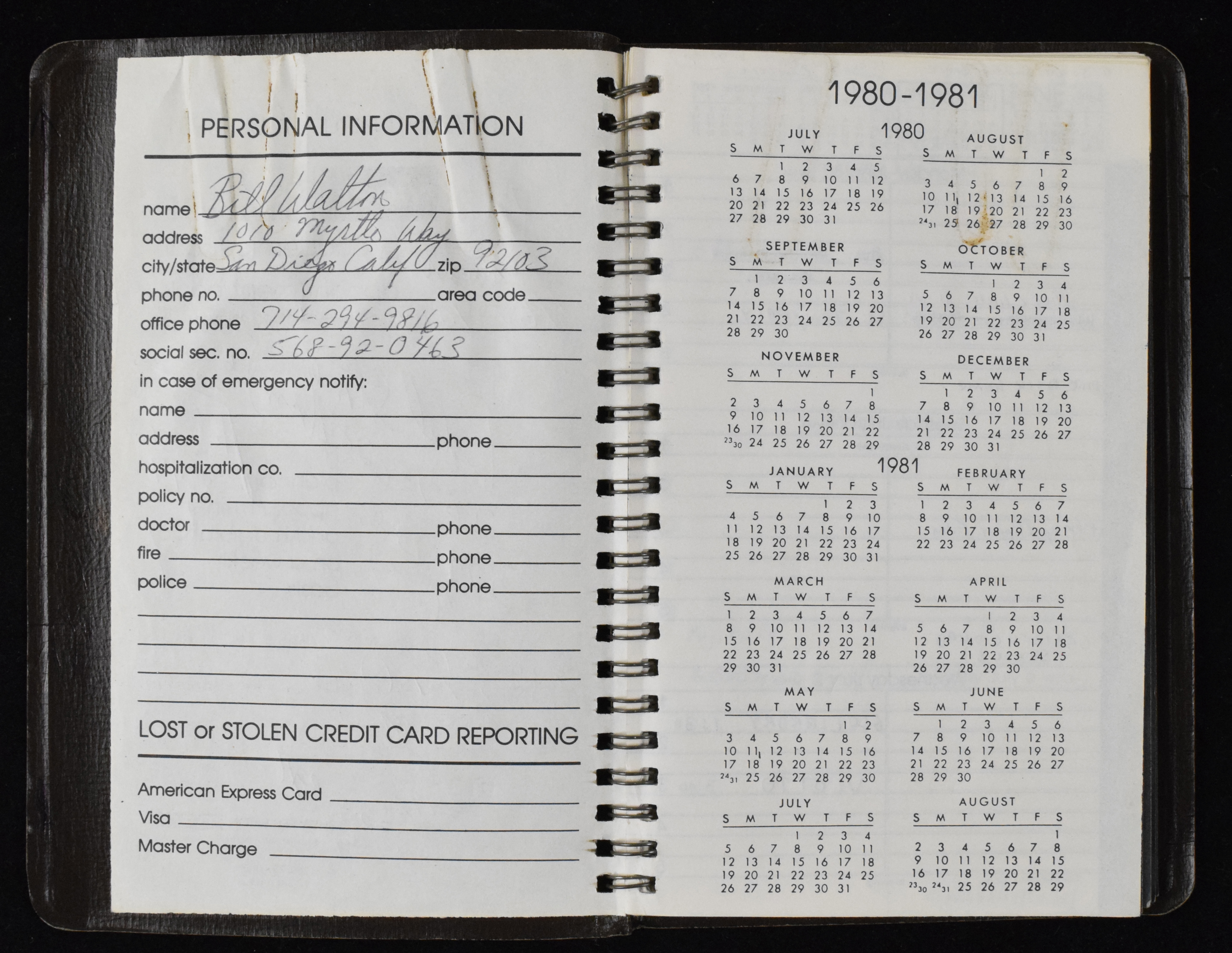 Description:Bill Walton signed 1980-81 weekly planner (EX). Leather cover planner has pages from July 1980 through August 1981. Walton signed the Personal Information page in black ink. Signature rates 8 out of 10 (paperclip stains on page). Numerous handwritten notes made by Walton throughout including "Kareem" "Chapman College", "John Wooden's Camp", "John Wooden Game Kareem", "John Wooden dinner Pauley", "Kareem's Birthday", and many other notations. Includes certificate of provenance from Walton Family: EX