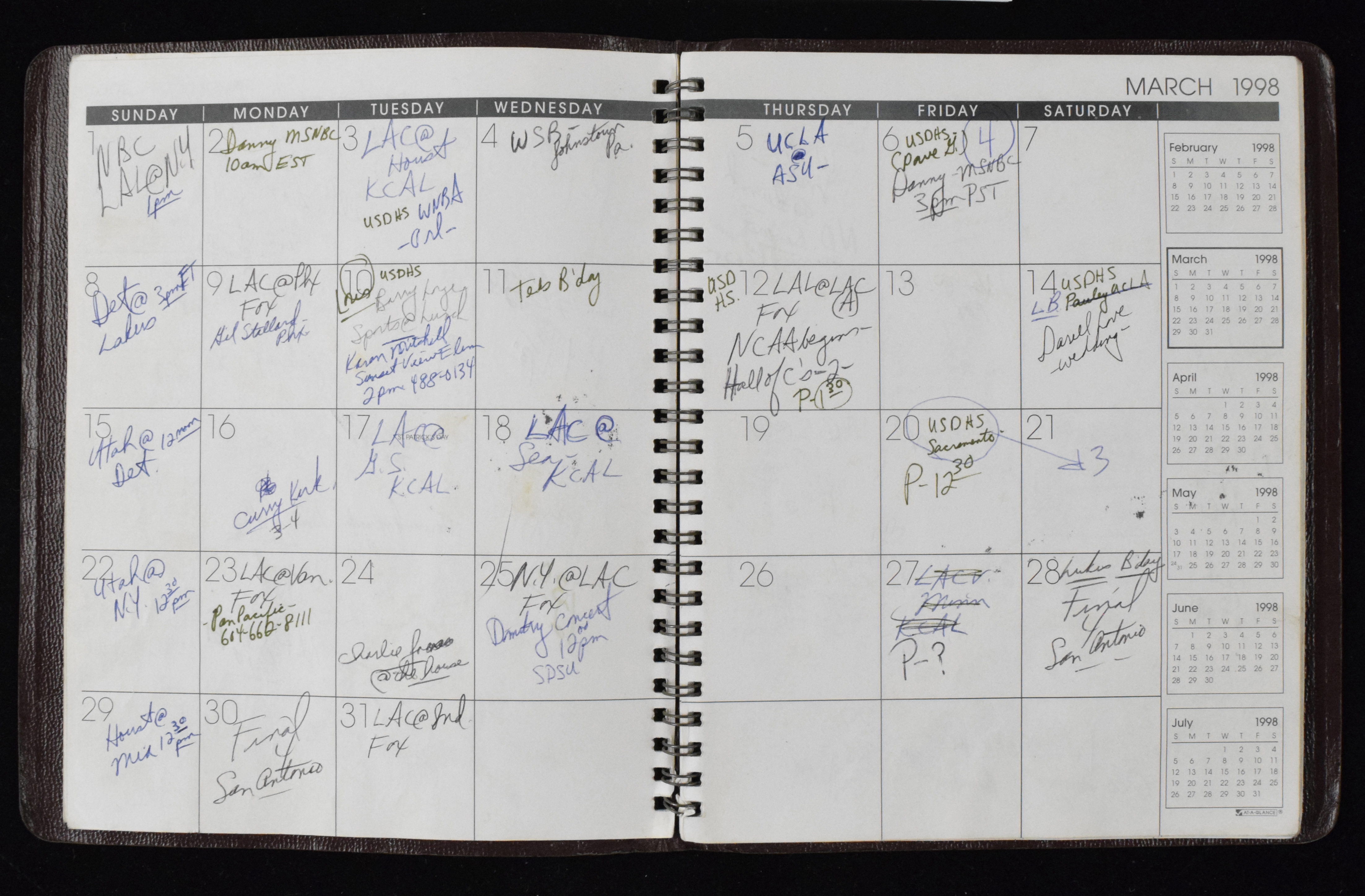 Description:Bill Walton's 1998 monthly planner (EX). Leather cover planner filled with Walton's hanbdwritten activities throughout the year (mostly schedule of games). Scattered stains. Includes certificate of provenance from Walton Family: EX