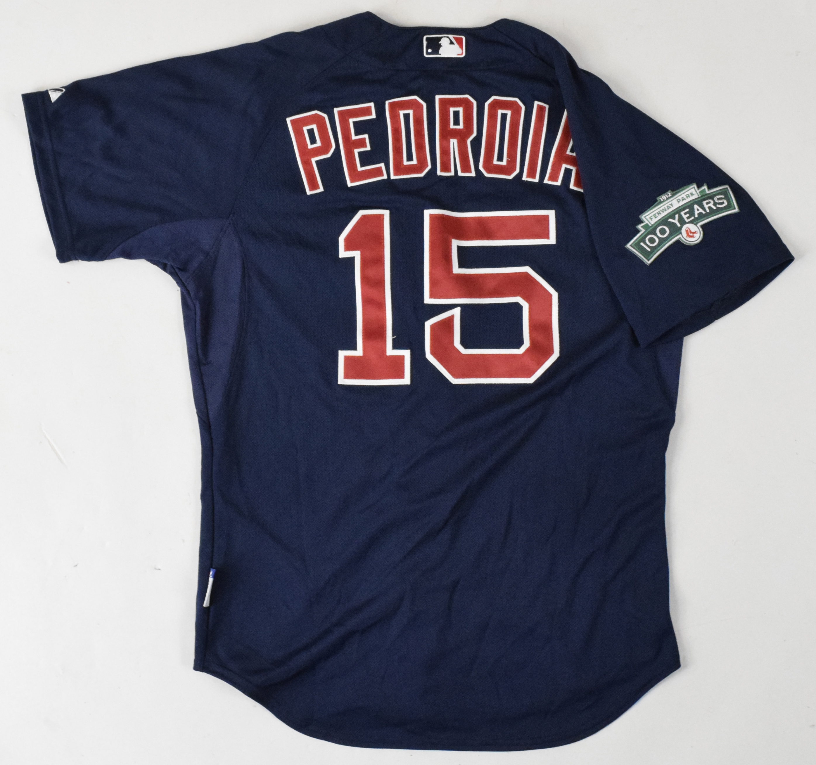 Description:2012 Dustin Pedroia game worn Boston Red Sox jersey with Fenway Park patch - MLB Authenticated (EX outstanding use, HR game). Majestic MLB Authentic Collection size 42 Red Sox #15 Dustin Pedroia jersey with Fenway Park 100 Years patch sewn on the right sleeve, and "15 42 '12" strip tag sewn on the front tail below the Majestic tagging. Pedroia wore the jersey during their July 27th game against the Yankees, going 2-4 with a homer. MLB Authenticated serial #EK203048 hologram sticker is on the jersey. Heavydirt stains on the front: EX ($1,000-$2,000)