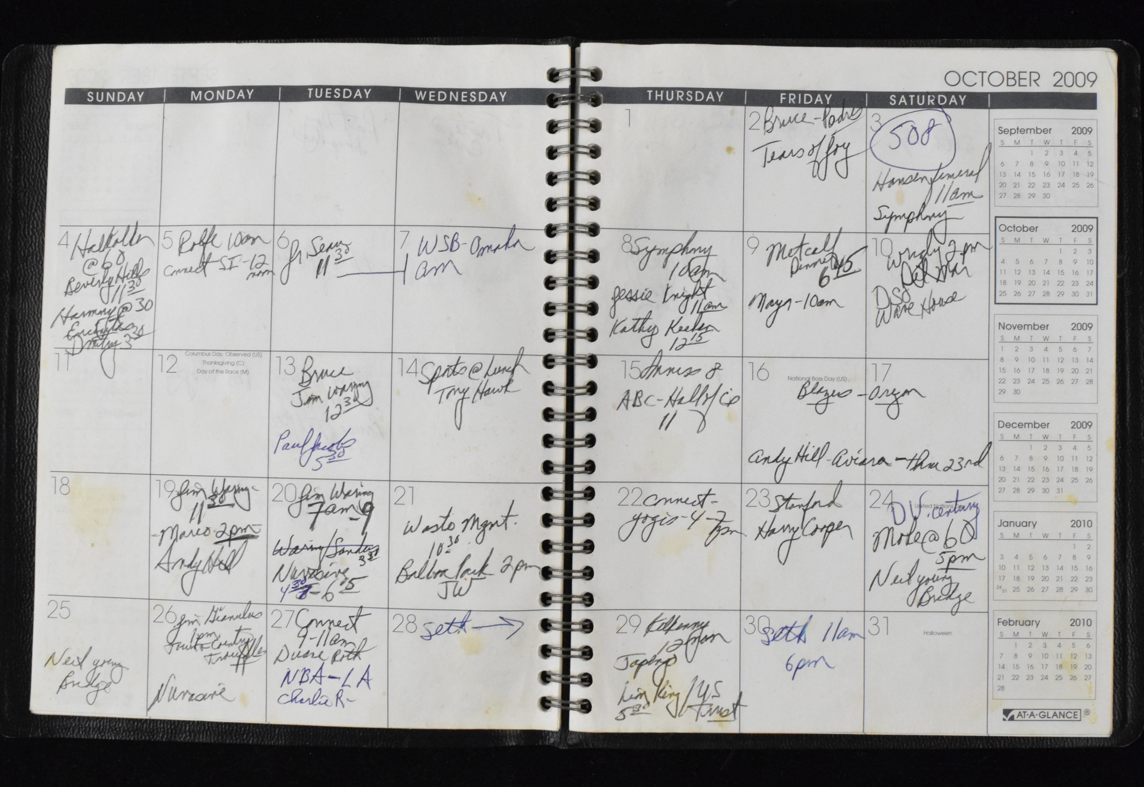 Description:Bill Walton's 2008-09 monthly planner (VG/EX). Leather cover planner containing September 2008 through December 2009 with Walton's handwritten activities throughout. Areas of moisture staining. Includes certificate of provenance from Walton Family: VG/EX