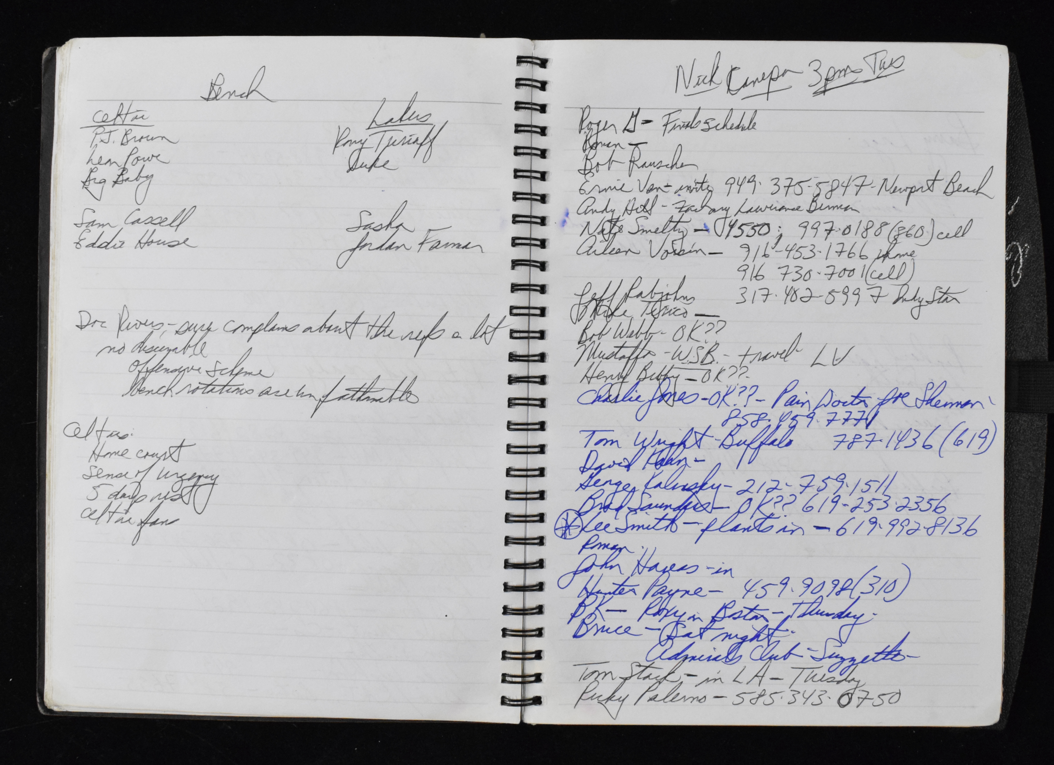 Description:Bill Walton's ESPN notebook, c.mid-late 2000s (VG/EX). 7.5"x10" notebook with ESPN on the cover containing approx. 60-pages of Walton's handwritten notes and contacts. Handling wear, along with some moisture stains on a few pages. Includes certificate of provenance from Walton Family: VG/EX