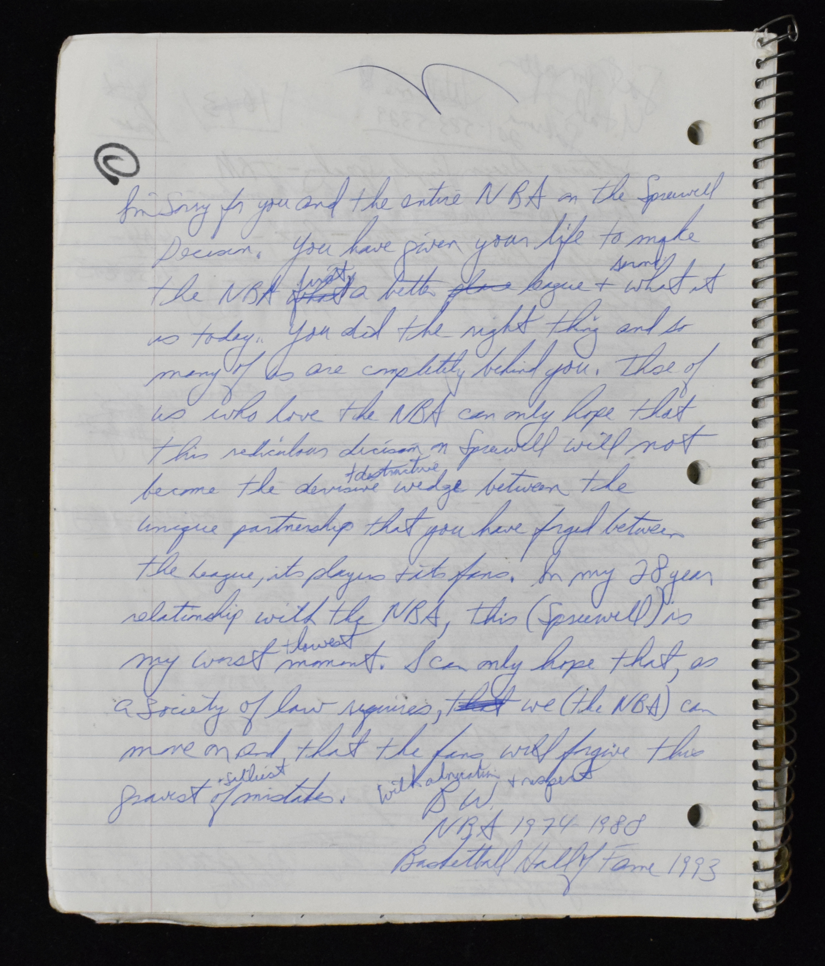 Description:Bill Walton's notebook with numerous notes including draft of letter regarding Sprewell/Carlesimo incident, c.1997 (VG/EX). Spiral notebook (missing front cover) filled with Walton's handwritten notes and various contact info. Most noteworthy, on the very last page, is a rough draft of Walton's letter written to David Stern regarding the infamous 1997 incident Latrell Sprewell choking P.J. Carlesimo. It contains poignant compliments from Walton to Stern for his work within the league, and relationships between the NBA, players, and fans including his concern for the league coming out of this incident. Walton signed the draft "B W" "NBA 1974-1988" "Basketball Hall of Fame 1993" (wear around the corners of the pages). Includes certificate of provenance from Walton Family: VG/EX
