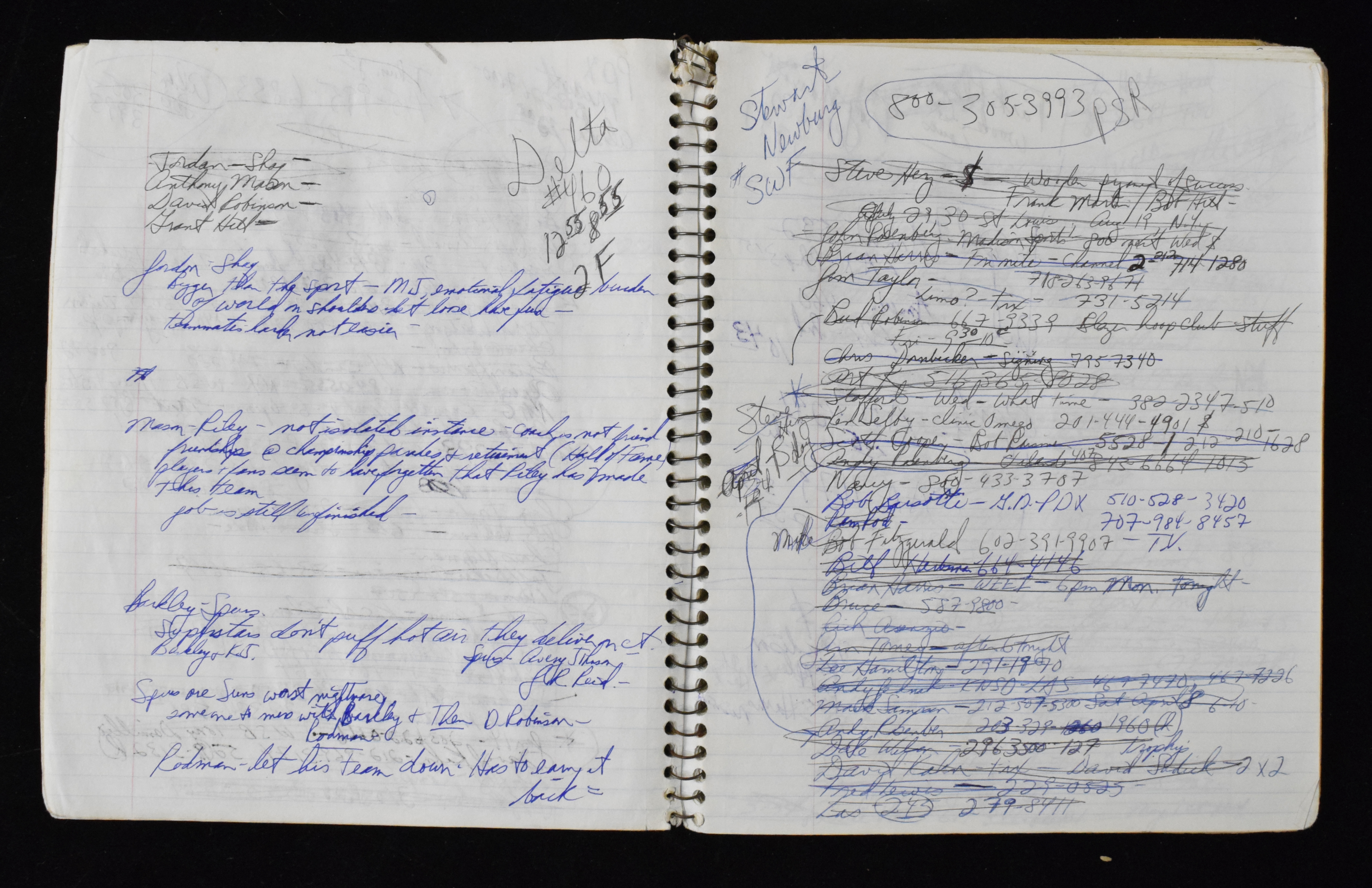 Description:Bill Walton's notebook filled with interesting notes, c.1995 (VG). Mead spiral notebook containing 90-sheets filled with a mix of contact info for various people along with Walton's handwritten notes including substantial NBA content (entire page on Scottie Pippen wanting out of Chicago, notes on Michael Jordan, etc). Fairly heavy handling wear. Includes certificate of provenance from Walton Family: VG