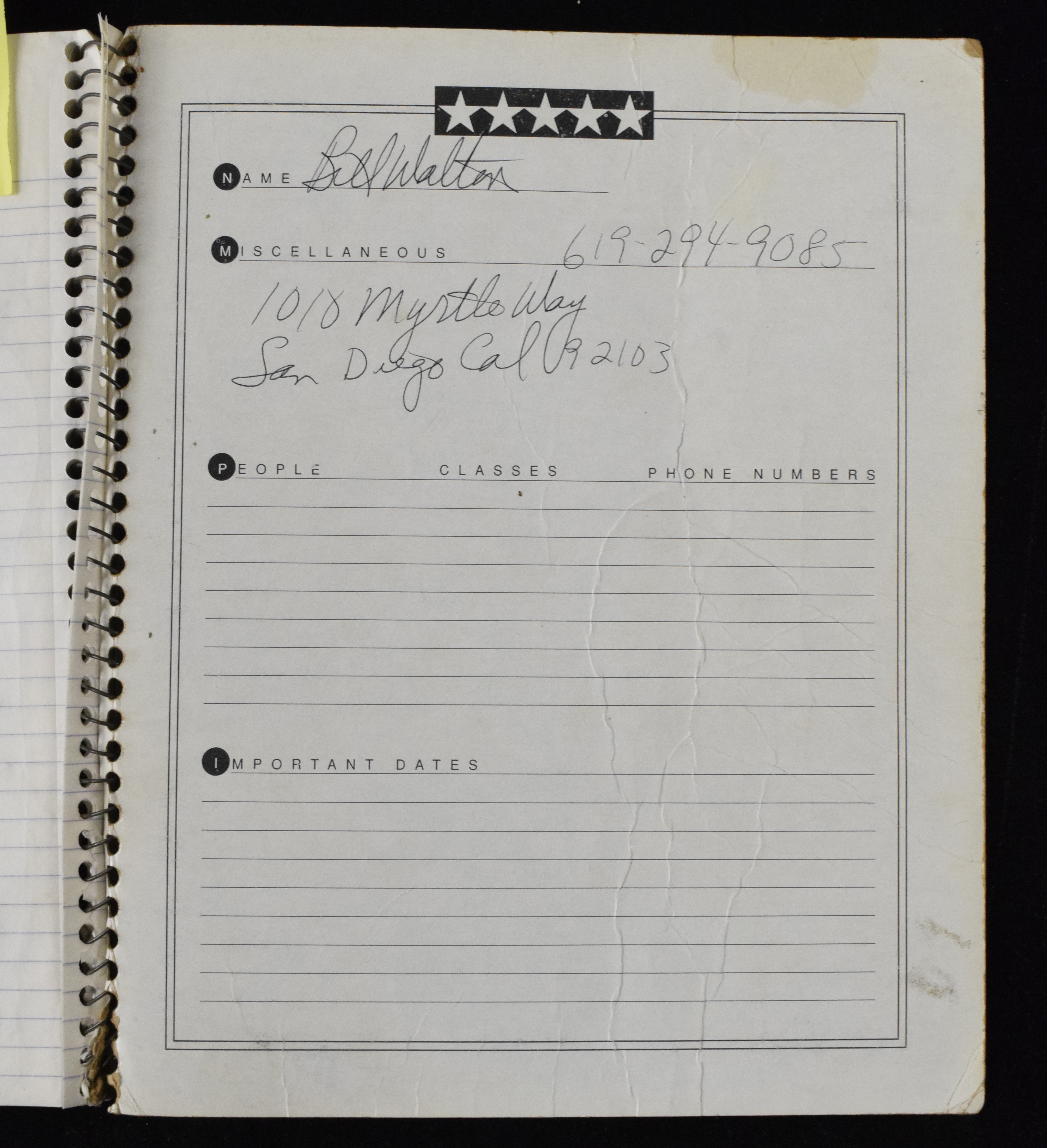 Description:Bill Walton signed NBC Sports notebook, c.1996-97 (VG/EX). Mead spiral notebook with NBC Sports patch on the cover. Filled with a mix of contact info for various people along with Walton's handwritten notes including NBA content. Walton signed the inside of the back cover in black ink. Signature rates 8/9 out of 10. Normal handling wear and some scattered stains. Includes certificate of provenance from Walton Family: VG/EX