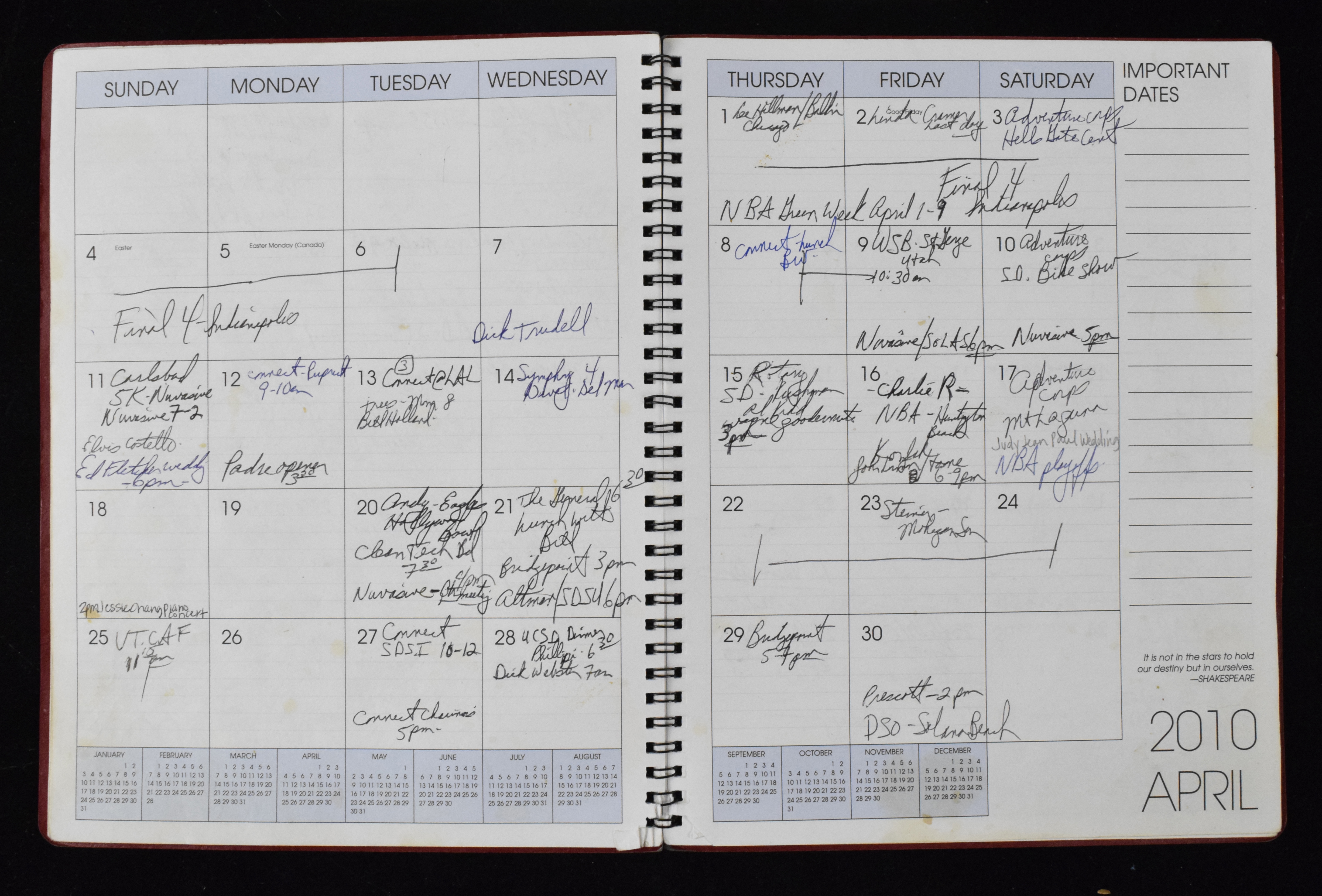 Description:Bill Walton's 2009-2010 monthly planner (EX). Leather cover planner contains August 2009 through December 2010 with Walton's handwritten activities throughout. Scattered stains. Includes certificate of provenance from Walton Family: EX