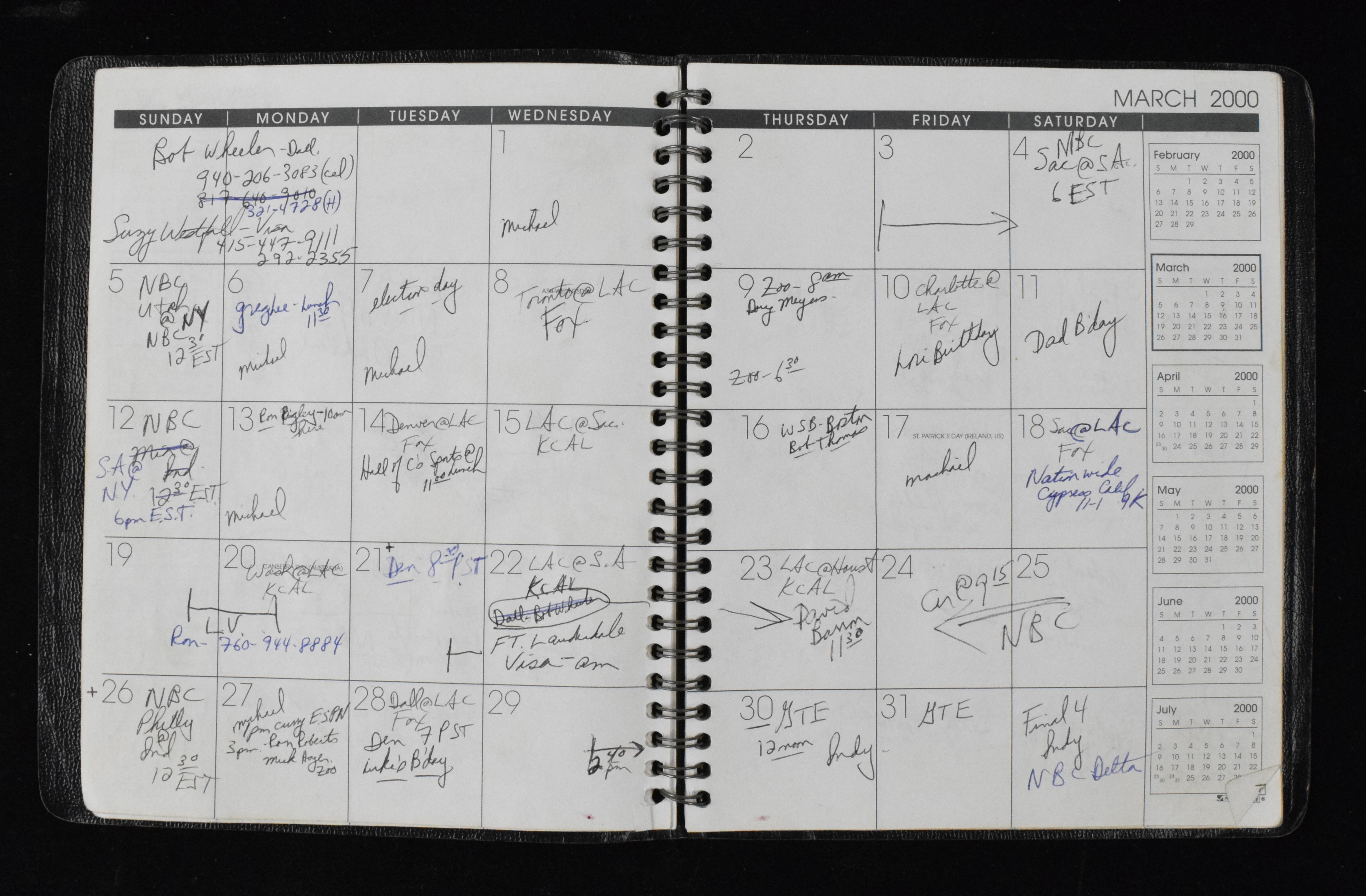 Description:Bill Walton's 1999-2000 monthly planner (EX). Leather cover planner contains September 1999 through December 2000 with Walton's handwritten activities throughout. Normal handling wear. Includes certificate of provenance from Walton Family: EX