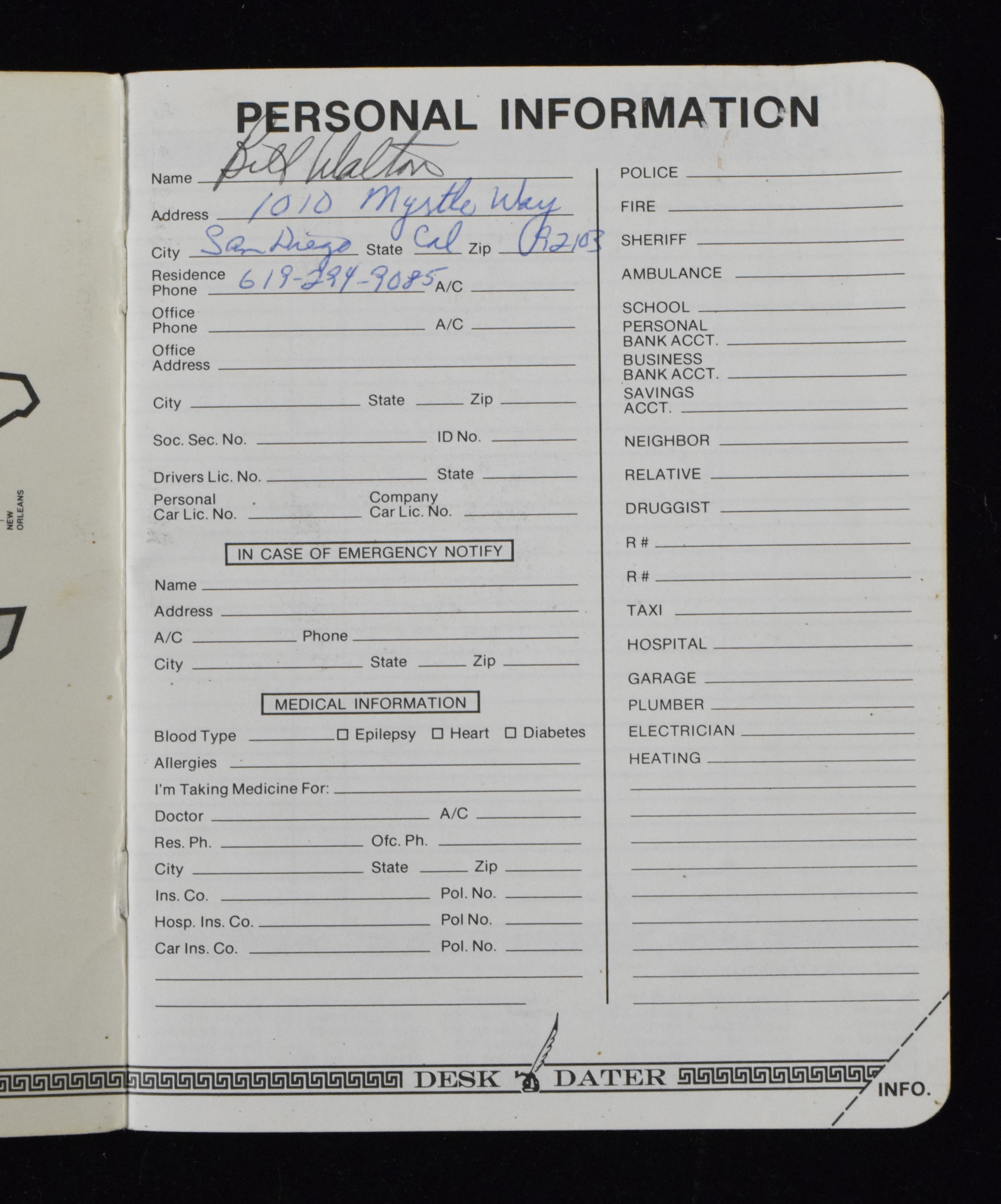 Description:Bill Walton signed 1991-92 monthly planner (VG/EX). 6"x7.75" planner containing September 1991 through December 1992 with Walton's handwritten activities throughout. Walton signed the Personal Information page in black ink. Signature rates 8 out of 10. Wear mainly on the cover. Includes certificate of provenance from Walton Family: VG/EX