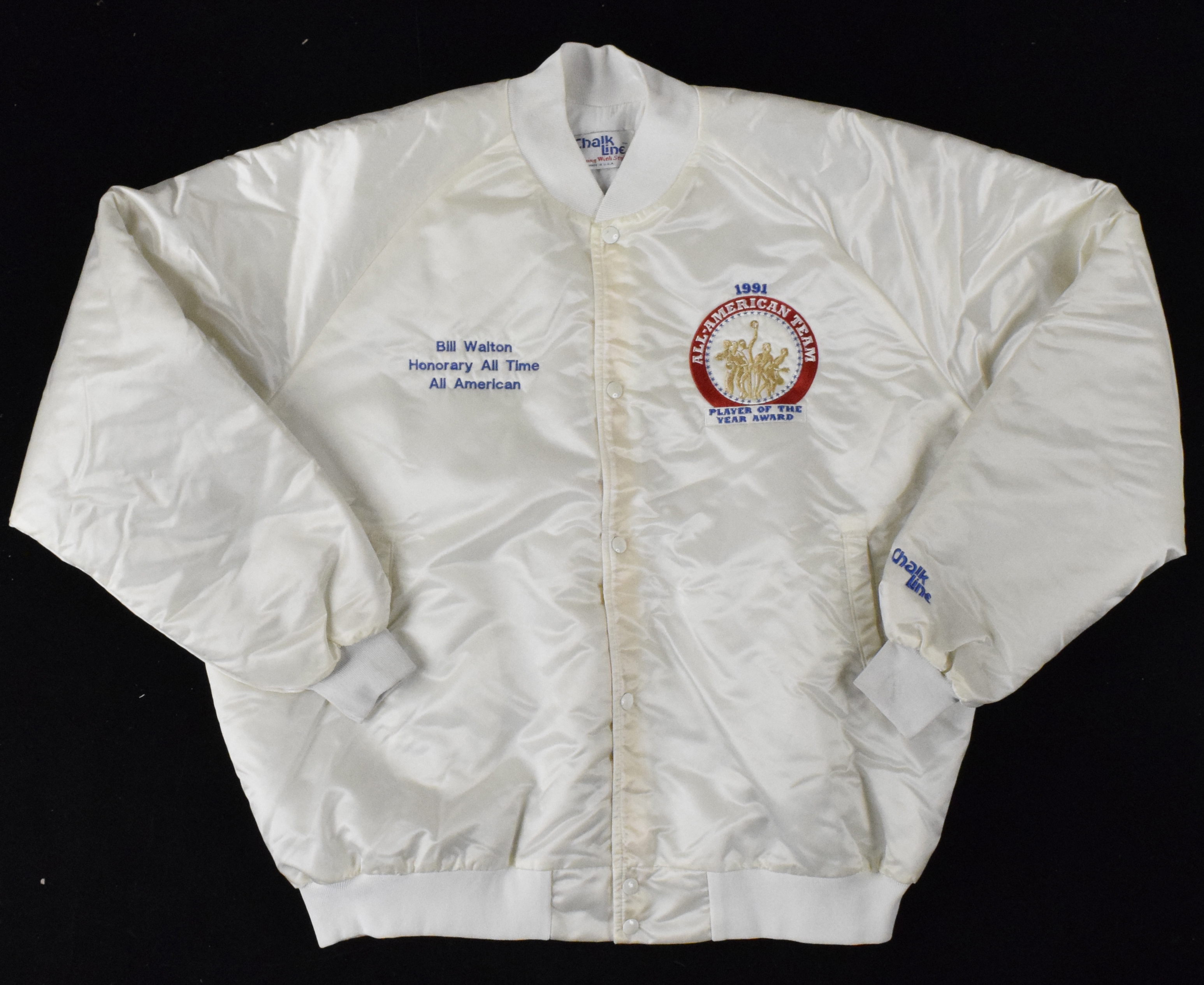 Description:Bill Walton's 1991 All Time All American Team jacket (EX). Chalk Line size 3XL-T jacket with Walton's name embroidered on the front right and "Honorary All Time All American" below, All-American Team patch on the front left, and large John R. Wooden Award logo patch on the back. Light staining along the button line. Includes certificate of provenance from Walton Family: EX