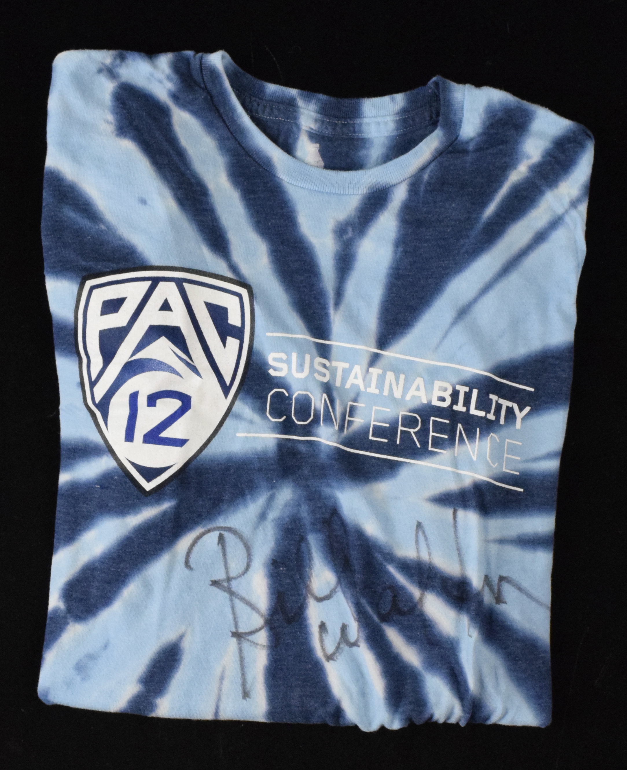 Description:Bill Walton signed PAC-12 tie-dye t-shirt (EX/MT). Renew Merchandise size XL Sustainsbility Conference shirt signed by Walton in black marker. Signature rates 7 out of 10. Includes certificate of provenance from Walton Family: EX/MT