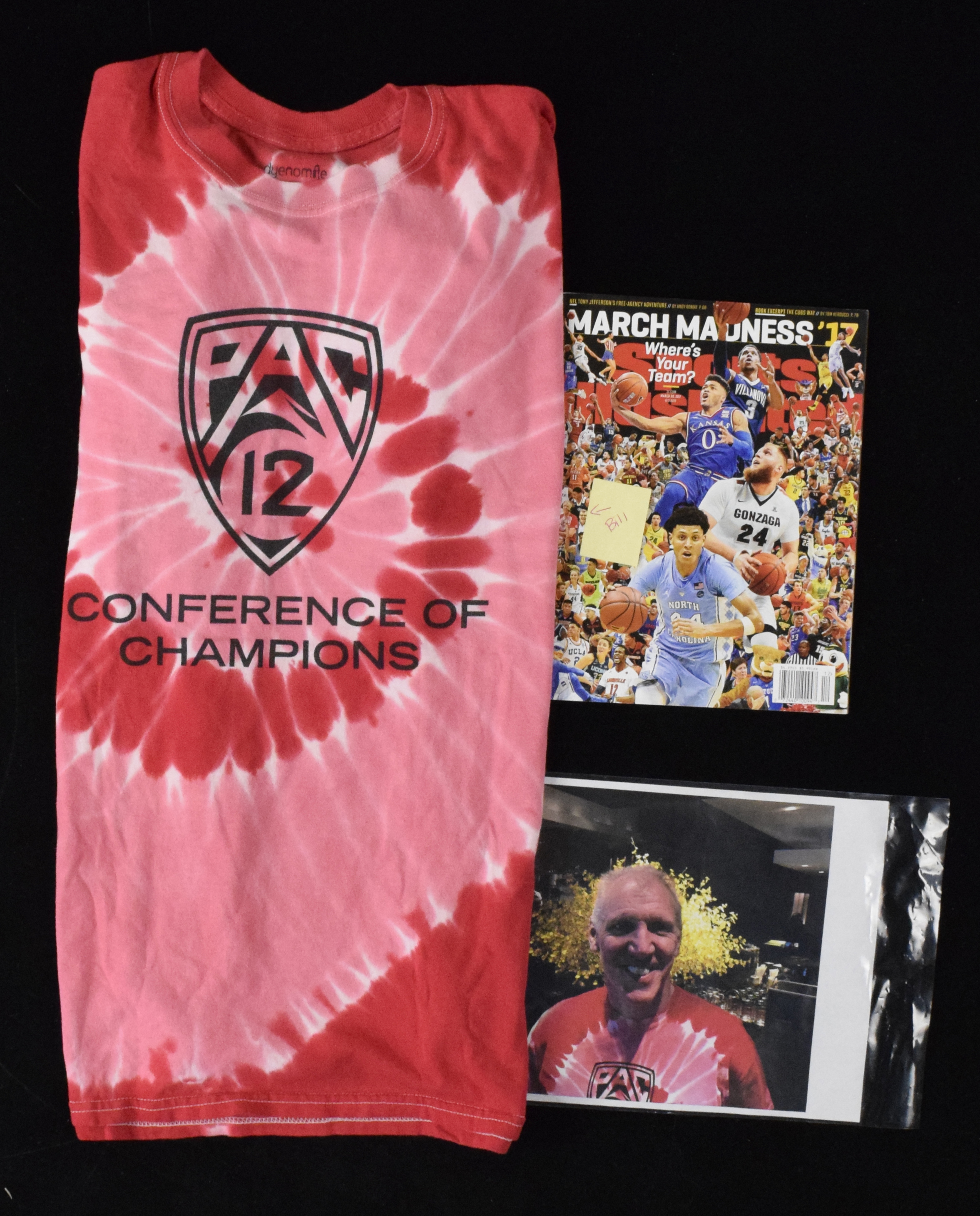 Description:Bill Walton's PAC-12 tie-dye t-shirt with related photo and Sports Illustrated (EX/MT). Dyenomite size XL Conference Of Champions shirt with 8.5"x11" printed off photo and 3/20/2017 Sports Illustrated picturing Walton wearing similar/same shirt. Includes certificate of provenance from Walton Family: EX/MT