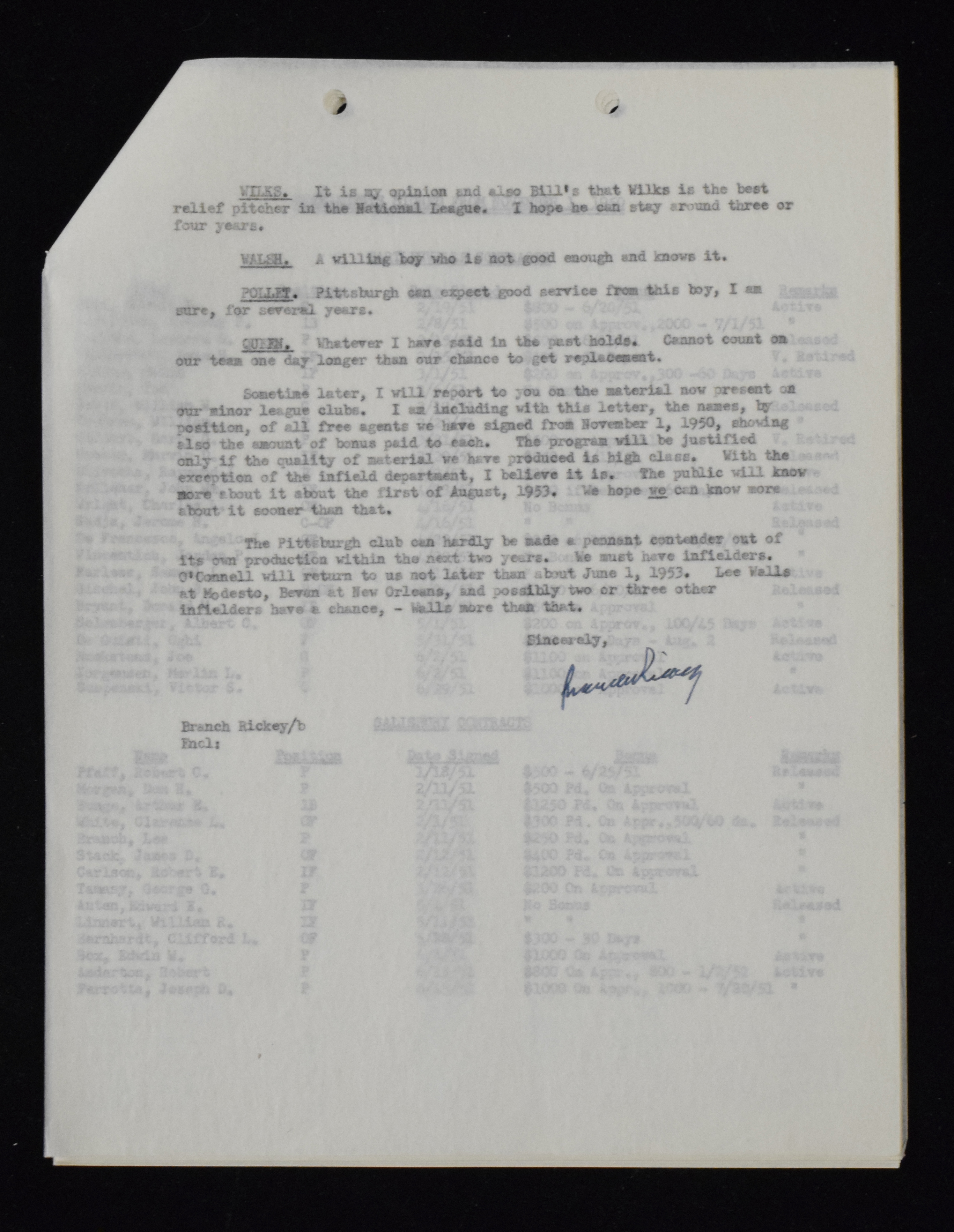 Description:Lengthy 1951 Branch Rickey autographed letter with player evaluation content - JSA (EX/MT). 4-page typed letter dated 7/7/1951 sent to Pittsburgh Pirates owner John Galbreath in which Rickey relays player evaluations on nearly the entire roster incuding Ralph Kiner, Joe Garagiola, etc. Rickey signed the letter in blue fountain pen. Signature rates 8/9 out of 10. Includes full LOA from JSA, and (4) pages listing minor league player contract salaries are stapled to the letter: EX/MT ($750-$1,500)