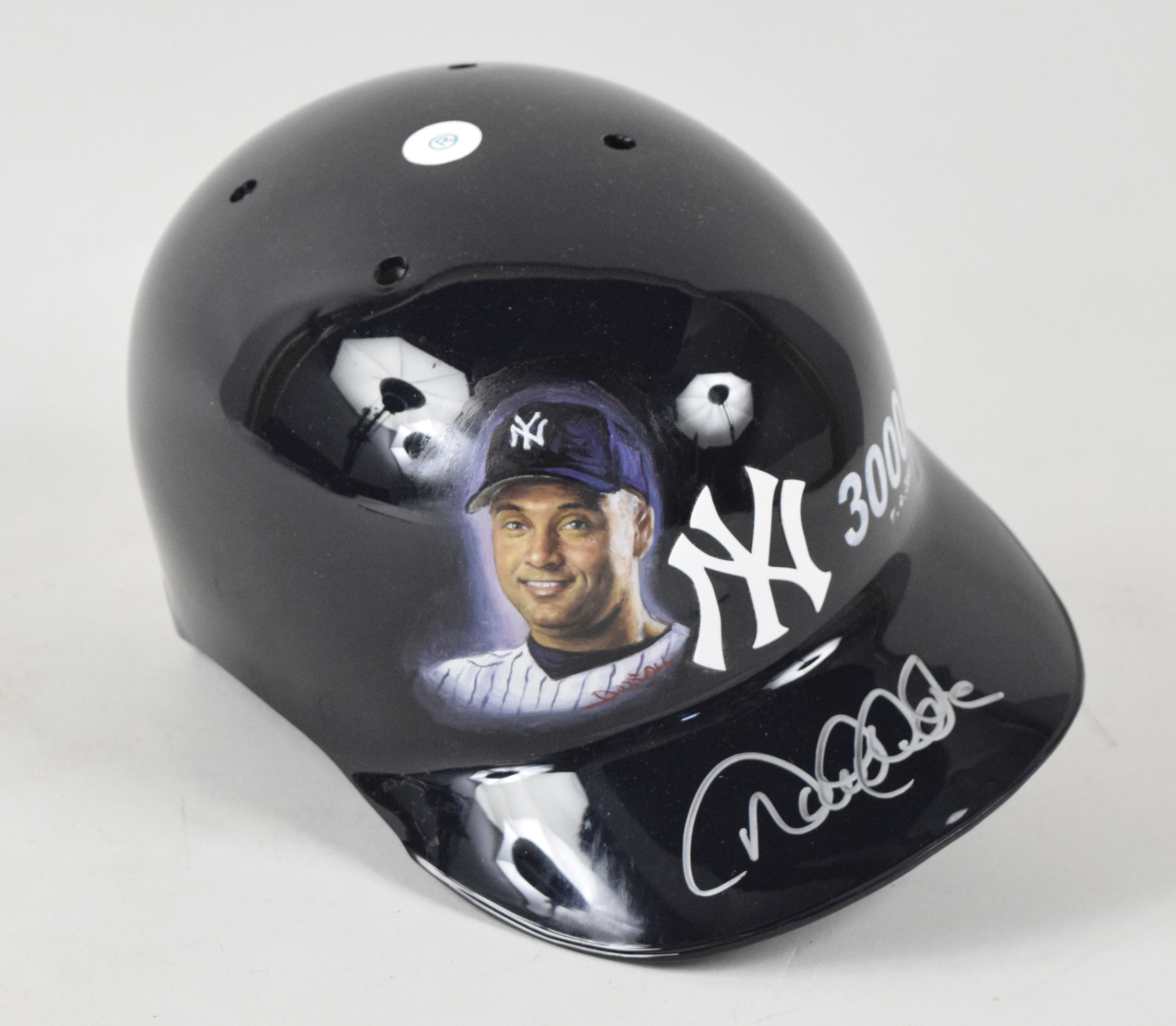 Description:Derek Jeter autographed Doo S. Oh handpainted New York Yankees batting helmet - Steiner & MLB Authenticated (NM). Rawlings size 6-7/8 Yankees commemorative 3000th hit helmet with portrait image of Jeter painted by Doo S. Oh. Jeter signed the helmet in silver marker. Signature rates 8/9 out of 10. Steiner and MLB Authenticated hologram stickers are on the helmet: NM ($500-$750)