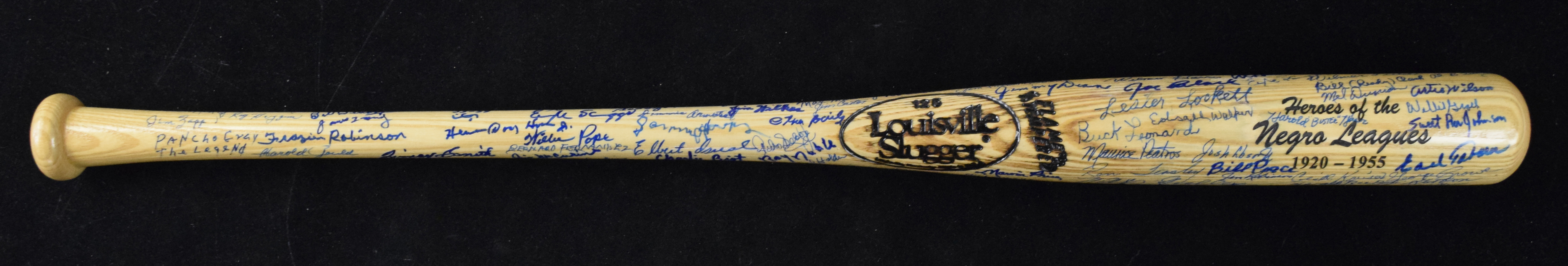 Description:Heros of the Negro League commemorative baseball bat with (110+) autographs (EX-NM) Louisville Slugger bat with "Heros of the Negro League" titling impressed in the barrel has been completely covered in autographs with over (110) signatures throughout. Notables include Buck Leonard, Russell Awkward, Gene Benson, Charlie Biot, Joe Black, Sherwood Brewer, Bill Cash, Mahlon Duckett, Wilmer Fields, Josh Gibson Jr, Stan Glenn, Nap Gulley, Wilmer Harris, Monte Irvin, Sam Jehtroe, Lester Lockett, Max Manning, Verdell Mathis, Buck ONeil, Art Pennington, Andy Porter, Double Duty Radcliffe, Edsall Walker, and many others. All are done in marker rating an average 8 out of 10 (general range runs 7 to 10). Little to no mentionable wear: EX-NM ($1,500-$2,500)