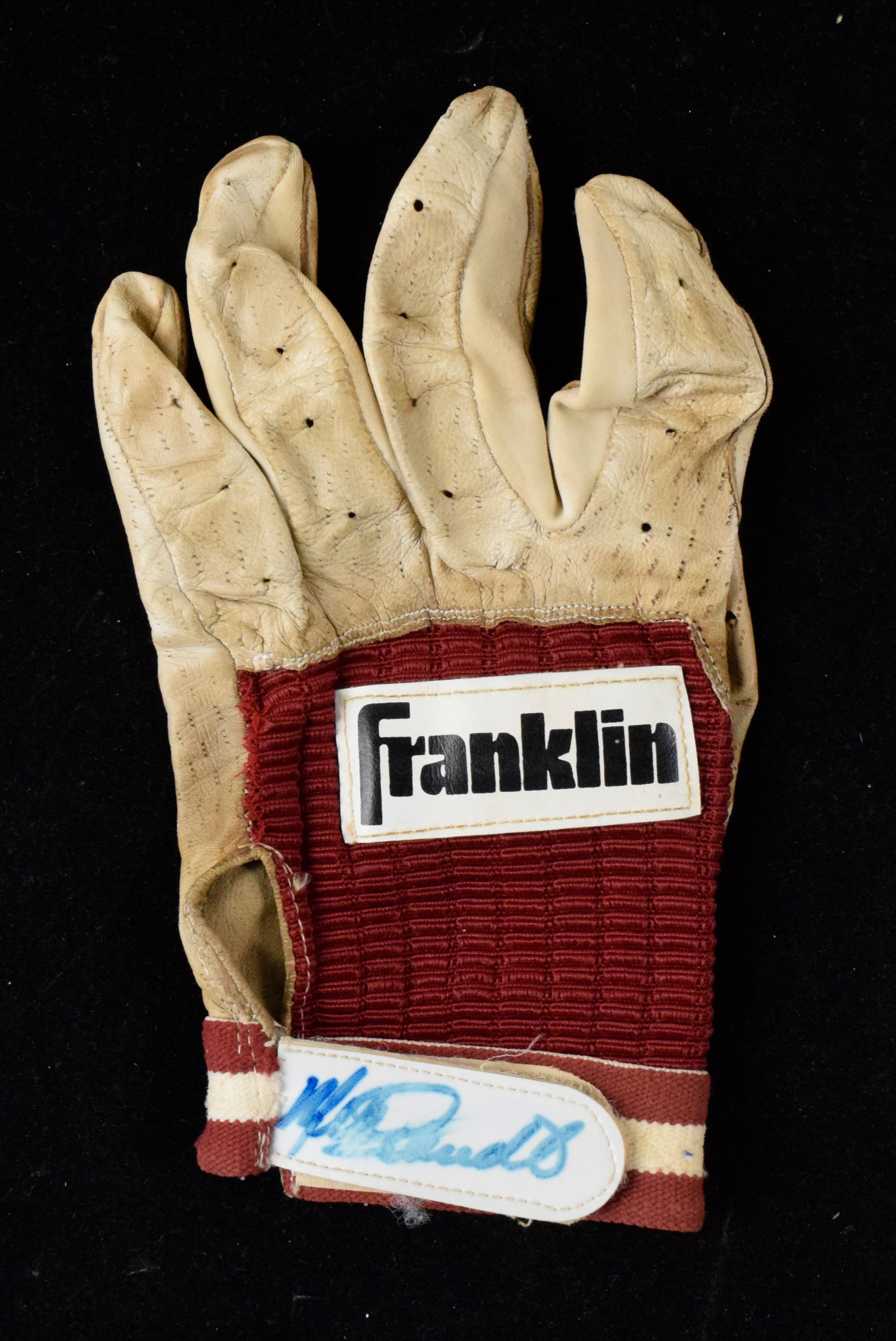 Description:Mike Schmidt autographed professional model batting glove, c.1980s (EX). Franklin size XL left hand glove signed by Schmidt in blue marker. Signature rates 6-6/7 out of 10 due to smudging. Impressive use with pine tar staining on the palm and fingers: EX ($400-$600)