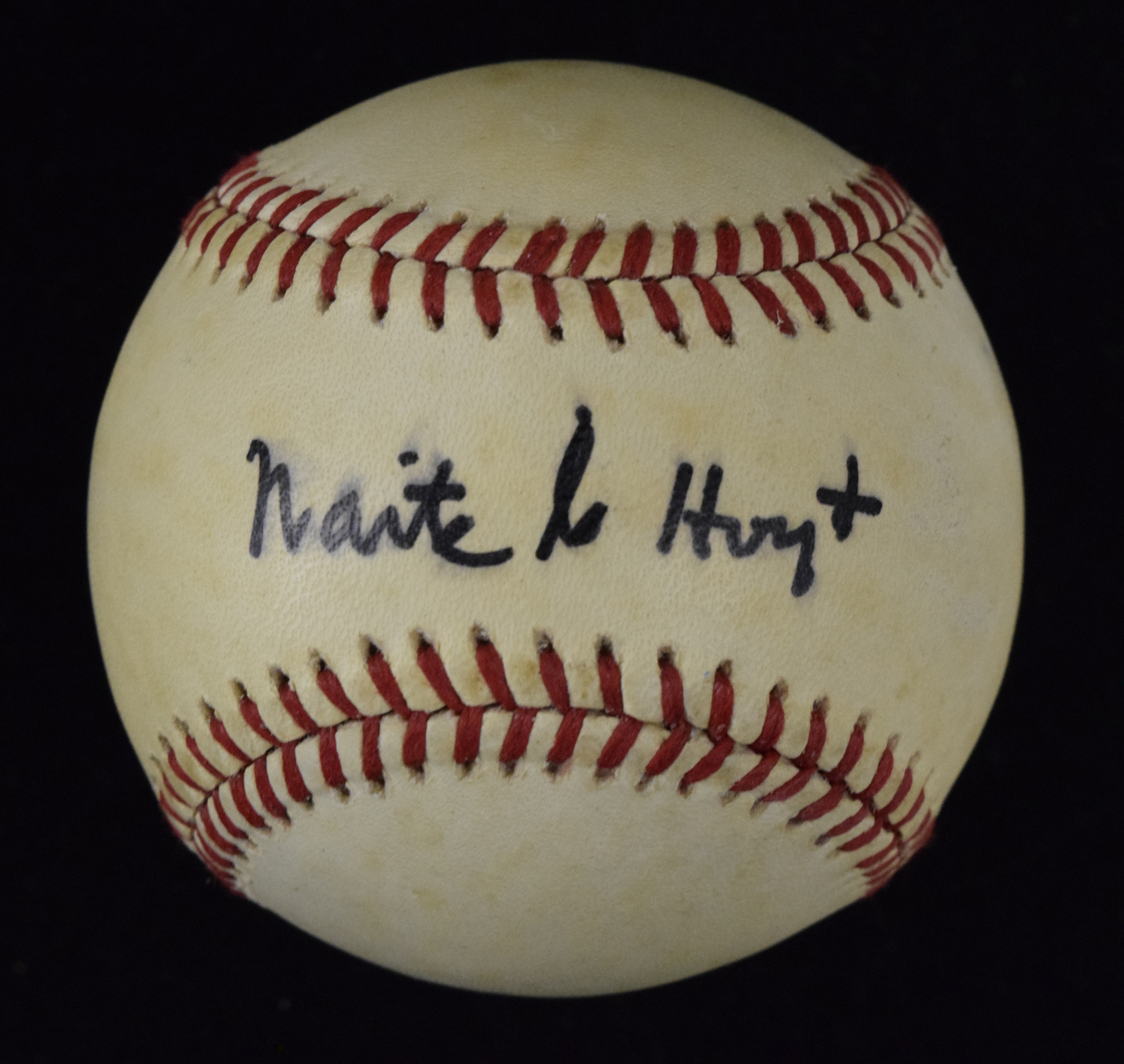 Description:Waite Hoyt single signed baseball (EX-EX/MT) Rawlings L.MacPhail Official American League baseball has been signed in marker rating 7/8 out of 10 (slight flaw). Ball has toned with a hint of surface wear: EX-EX/MT ($750-$1,250)