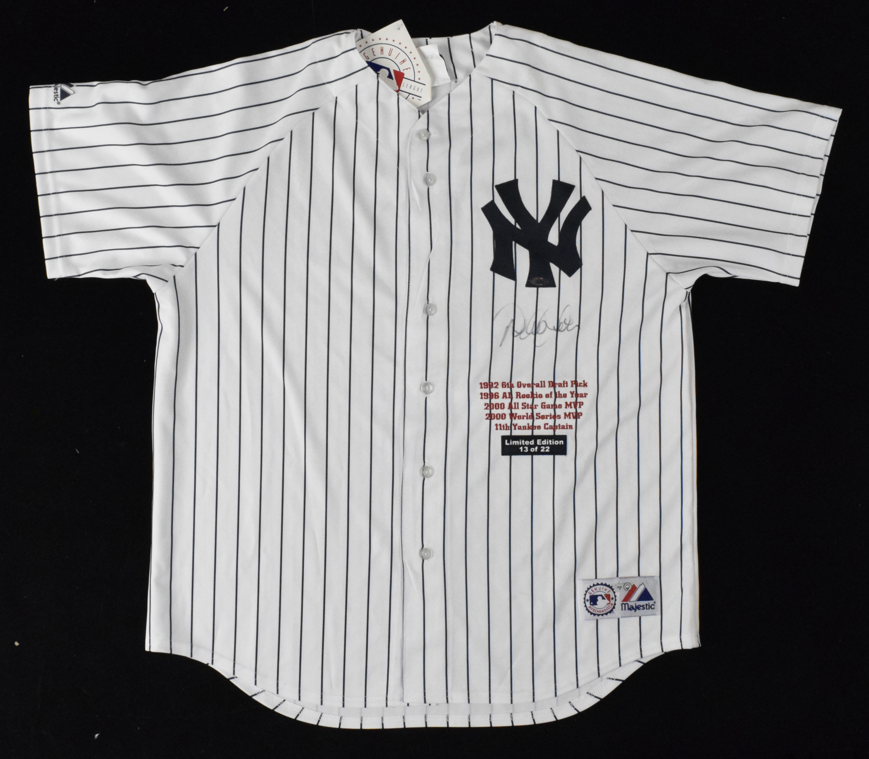 Description:Derek Jeter autographed limited edition jersey with Steiner, MLB authentication (Sig. EX/MT). Majestic size XL limited edition New York Yankees jersey (numbered 13/22 with stat embroidery) has been signed on the front by Derek Jeter in black marker, rating 6 out of 10 (light fading). Steiner and MLB authentication stickers are also affixed to the front of the jersey, and a basic cert is also included. Jersey, which has its original retail tag, has a small stain in the collar area, but no other mentionable wear: NM. ($500-$1,000)