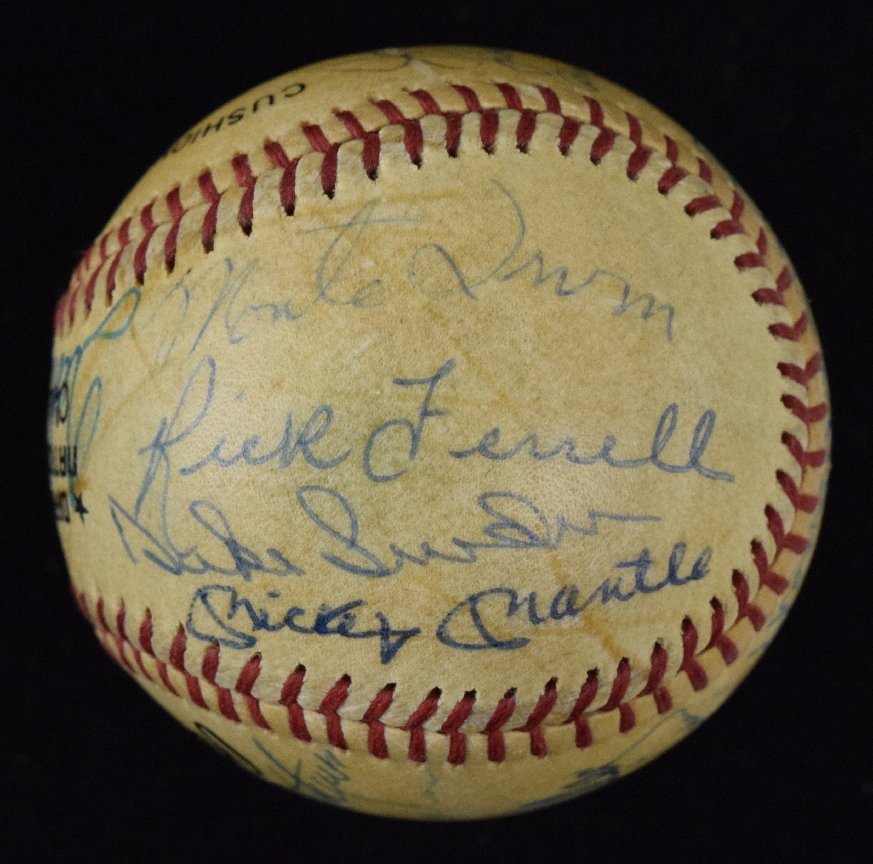 Description:Hall of Fame themed baseball with (20) Inductee autographs incl. Mantle and Williams (VG-EX) Rawlings C.Feeney Official National League baseball has been signed throughout by members of the Hall of Fame. Notables include Mickey Mantle, Ted Williams (over stampings), Duke Snider, Willie Mays, Judy Johnson, Buck Leonard, Eddie Mathews, and Harmon Killebrew. Ink signatures generally rate 7 out of 10 or better with a few lesser. Ball has toned throughout: VG-EX ($400-$600)