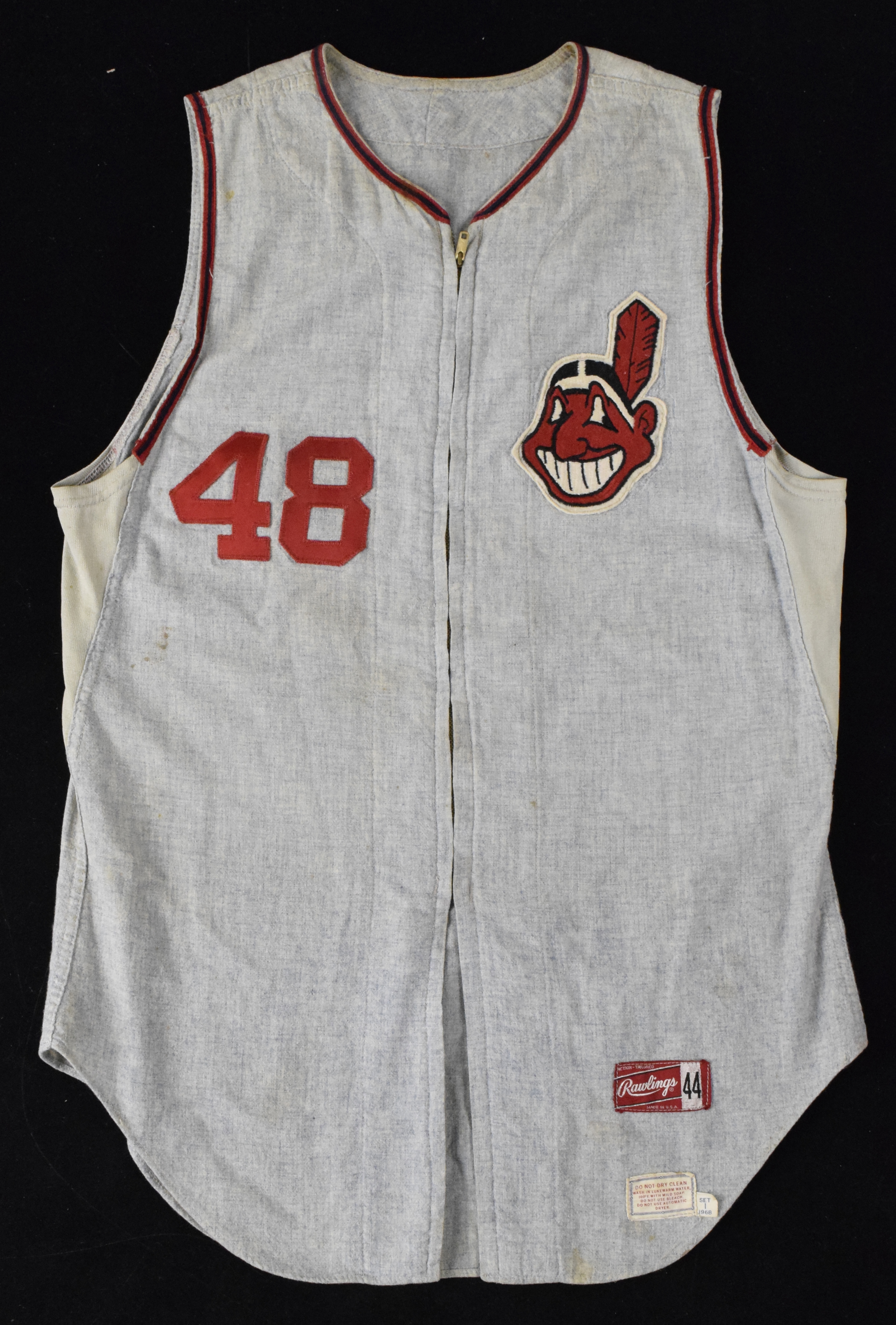 Description:1968 Cleveland Indians professional model road jersey (See description) Gray flannel vest style jersey has an original team logo patch on the left front chest and number ""48"" on both the front and back. All of these applied pieces have either been replaced or restitched in place. Rawlings tag on the front tail notes size (44) and the wash tag below has adjacent ""Set 1 1968"" flag tag. Use and wash wear are evident throughout with some minor scattered discoloration: See description ($400-$600)
