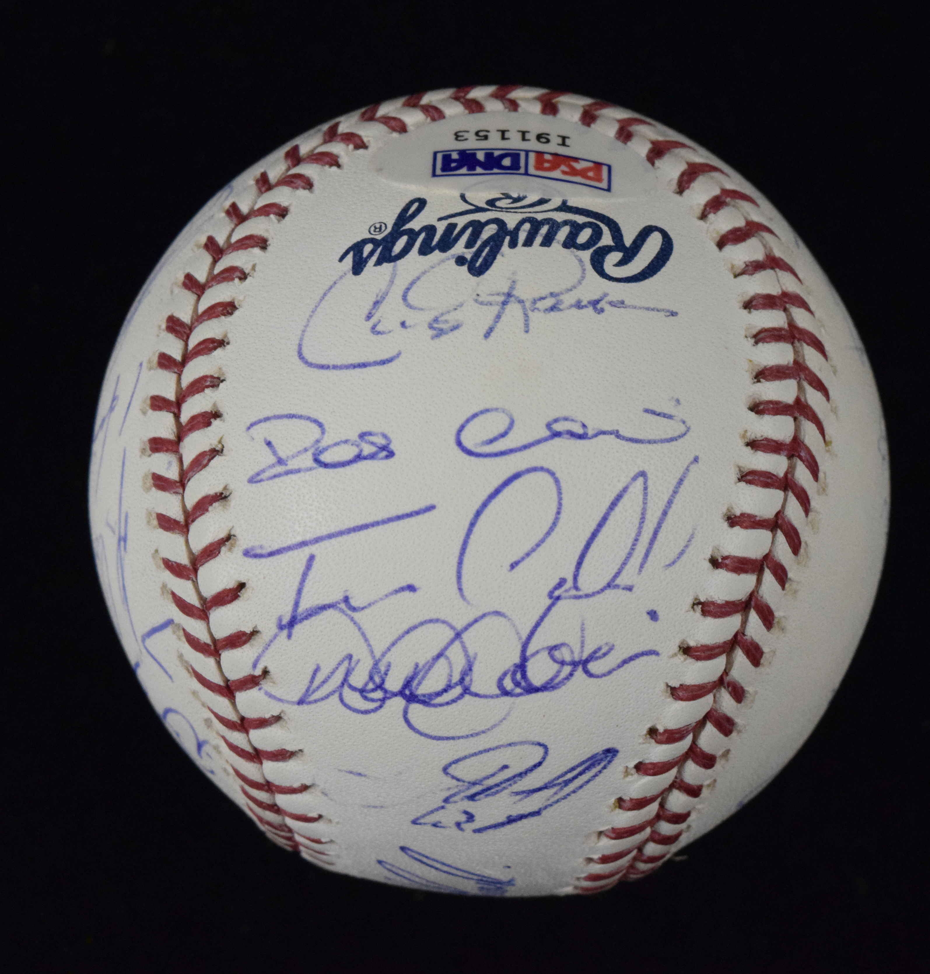 Description:2009 World Series champion New York Yankees team signed baseball - PSA/DNA (NM). 2009 Yankee Stadium Inaugural Season ball signed by (25) including Joe Girardi, Mariano Rivera, Derek Jeter, C.C. Sabathia, Alex Rodriguez, Mark Teixeira, A.J. Burnett, Robinson Cano, Johnny Damon, Jorge Posada, Hideki Matsui, Phil Hughes, Melky Cabrera, Nick Swisher, Joba Chamberlain, and others. Signatures rate 6/7 to 9 (avg 7/8) out of 10 due to some scattered fading. PSA/DNA serial #I91153 sticker is on the ball: NM ($400-$600)